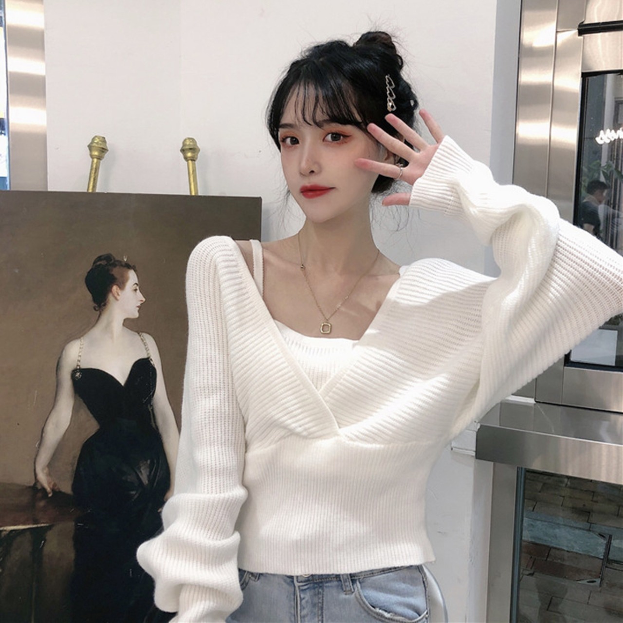 Nomikuma 2020 ショートスリム女性プルオーバーニット長袖 V ネックセクシーなストラップレスニットトップスプル 6C488 ロング Vネック kor78548340298