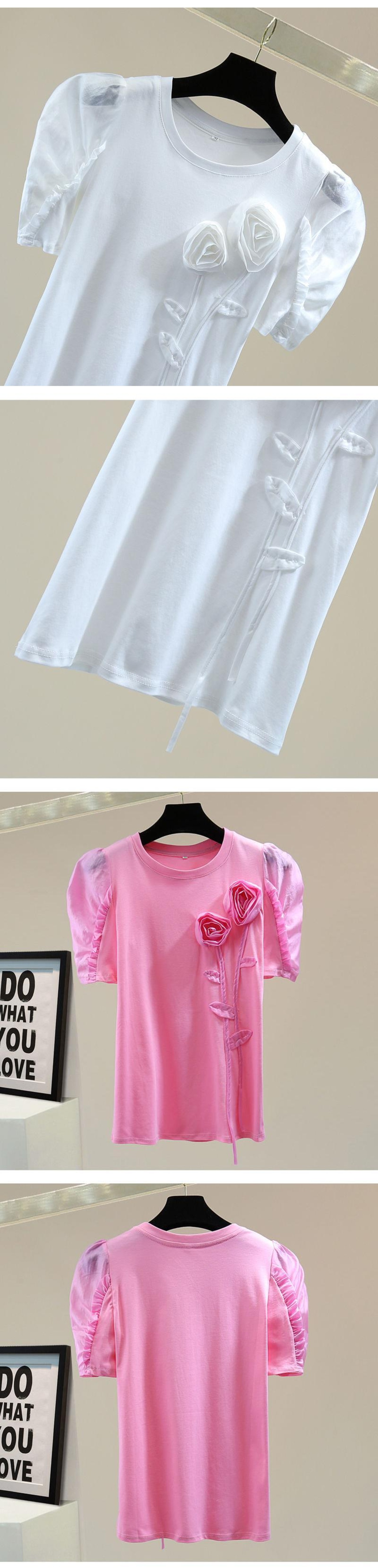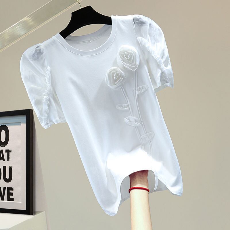 Nomikuma シックな 3D 花シャツ女性フリルパフスリーブグラフィック Tシャツ因果 O ネック 2022 夏 Tシャツ サマー 夏物 Oネック フラワーデザイン kor5283580639