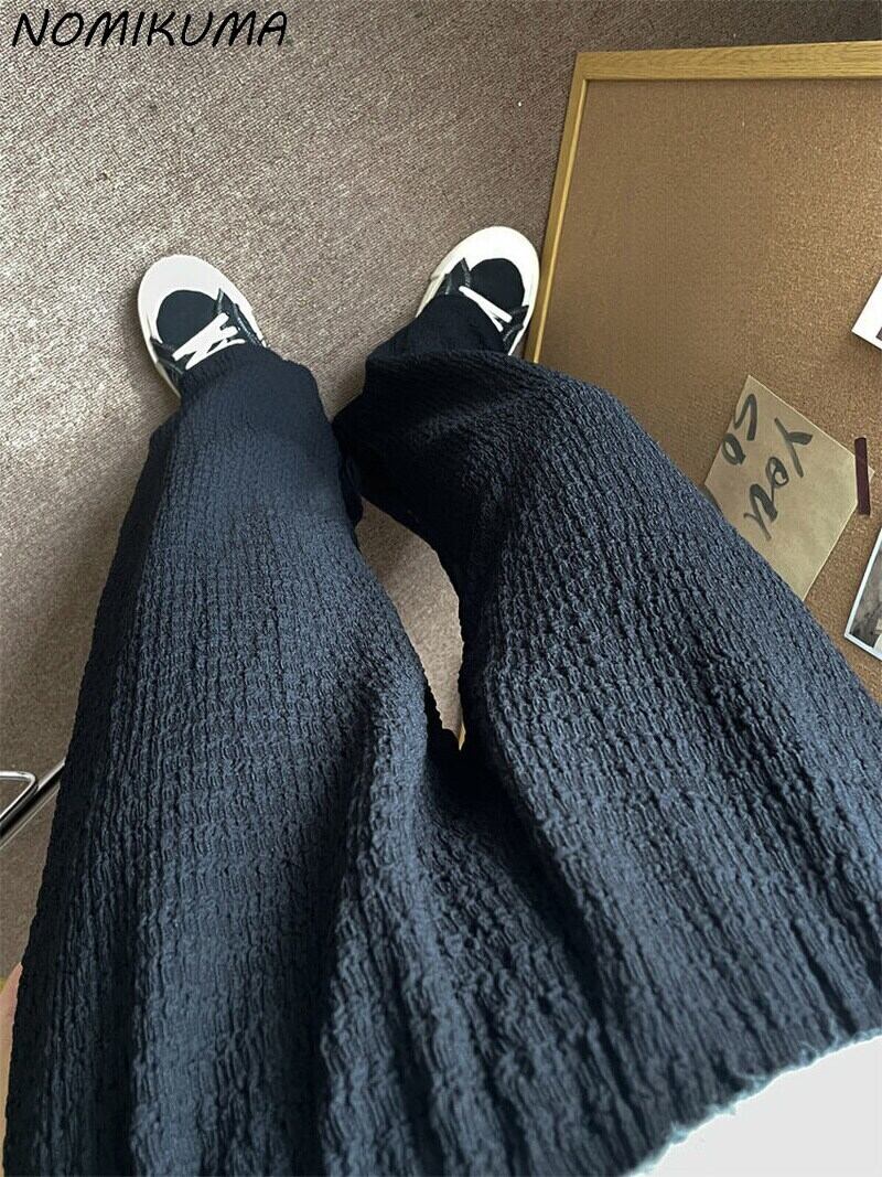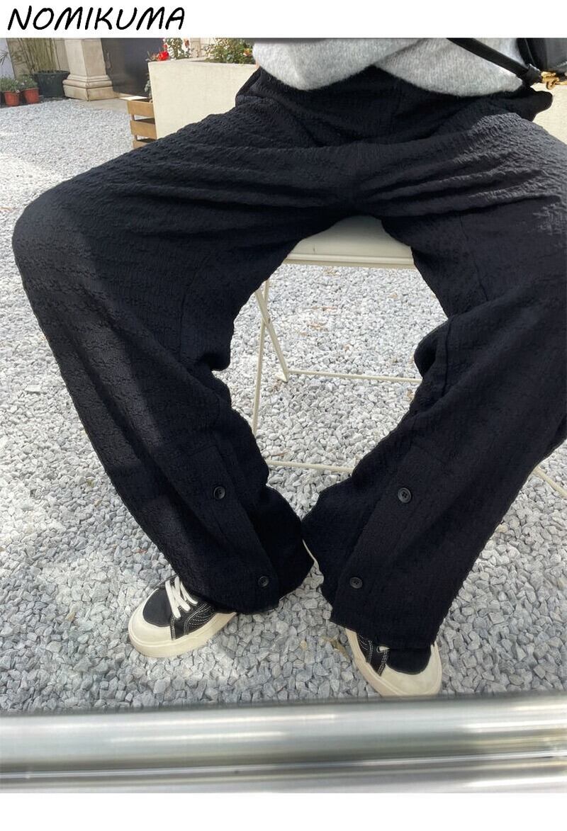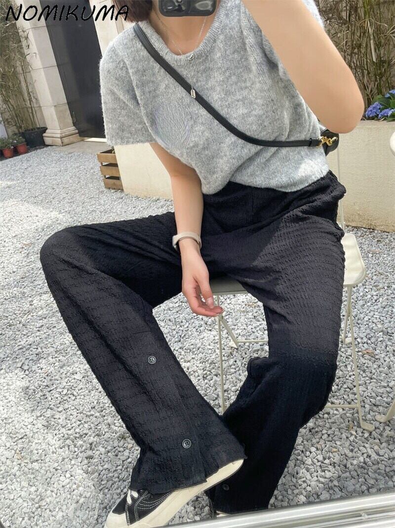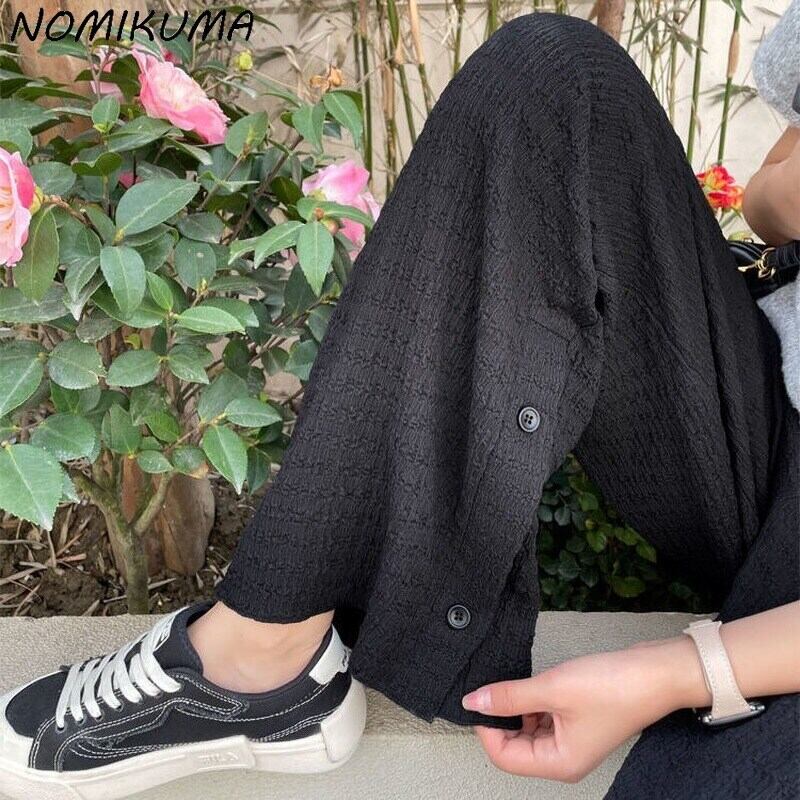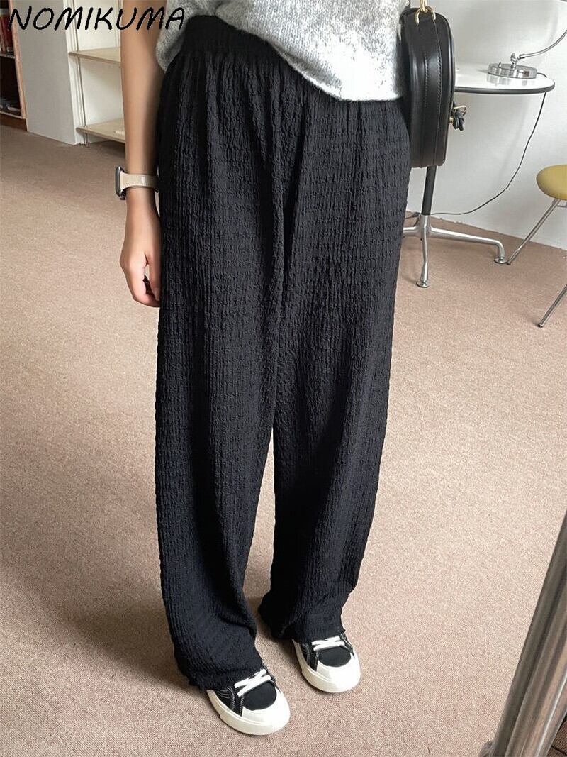 Nomikuma スタイル パンツ女性 2022 夏弾性ウエスト ワイド脚因果黒長ズボン ロング ブラック エラスティック 伸縮 サマー 夏物 ワイドレッグ ワイドパンツ kor55825626568
