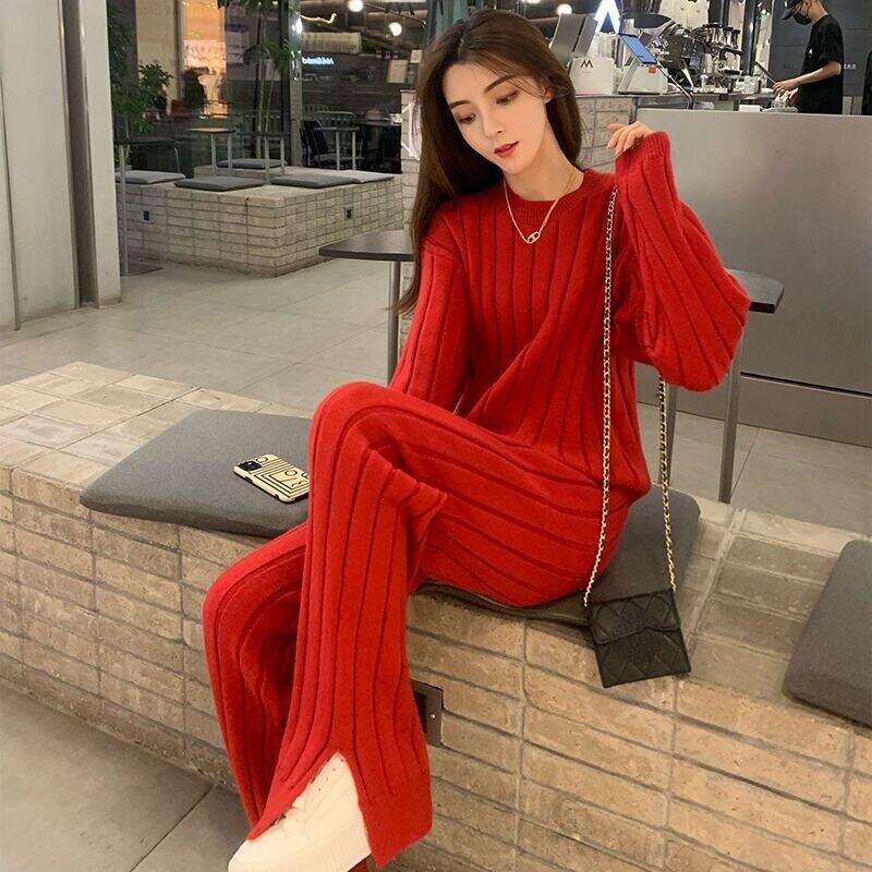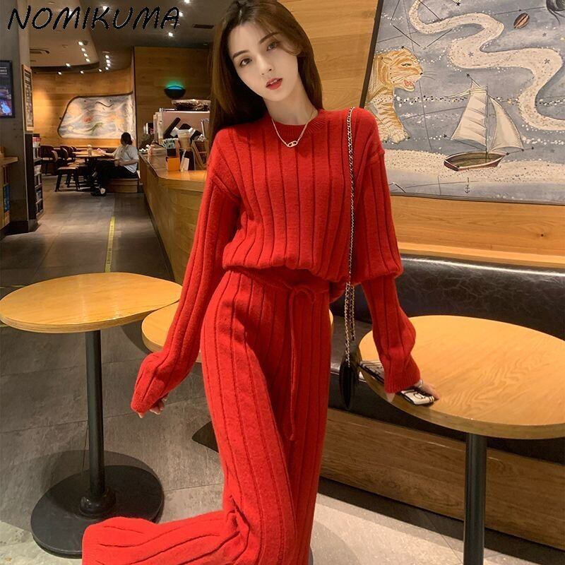 ノミクマニットツーピース女性セット長袖 O ネックプルオーバーセーター + レースアップウエストロングスプリットワイドレッグパンツ 2022 Oネック ワイドパンツ kor68599230493