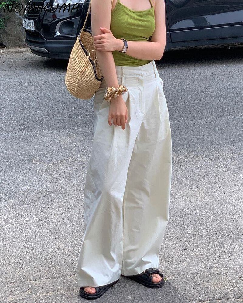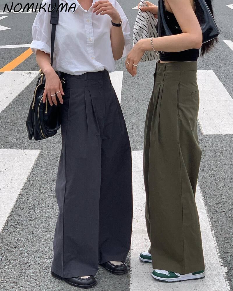Nomikuma サファリスタイルワイドレッグパンツ 2022 夏ウエスト長ズボン因果無地女性パンツ Pantalones デ ロング サマー 夏物 ワイドパンツ ソリッドカラー kor63537332466