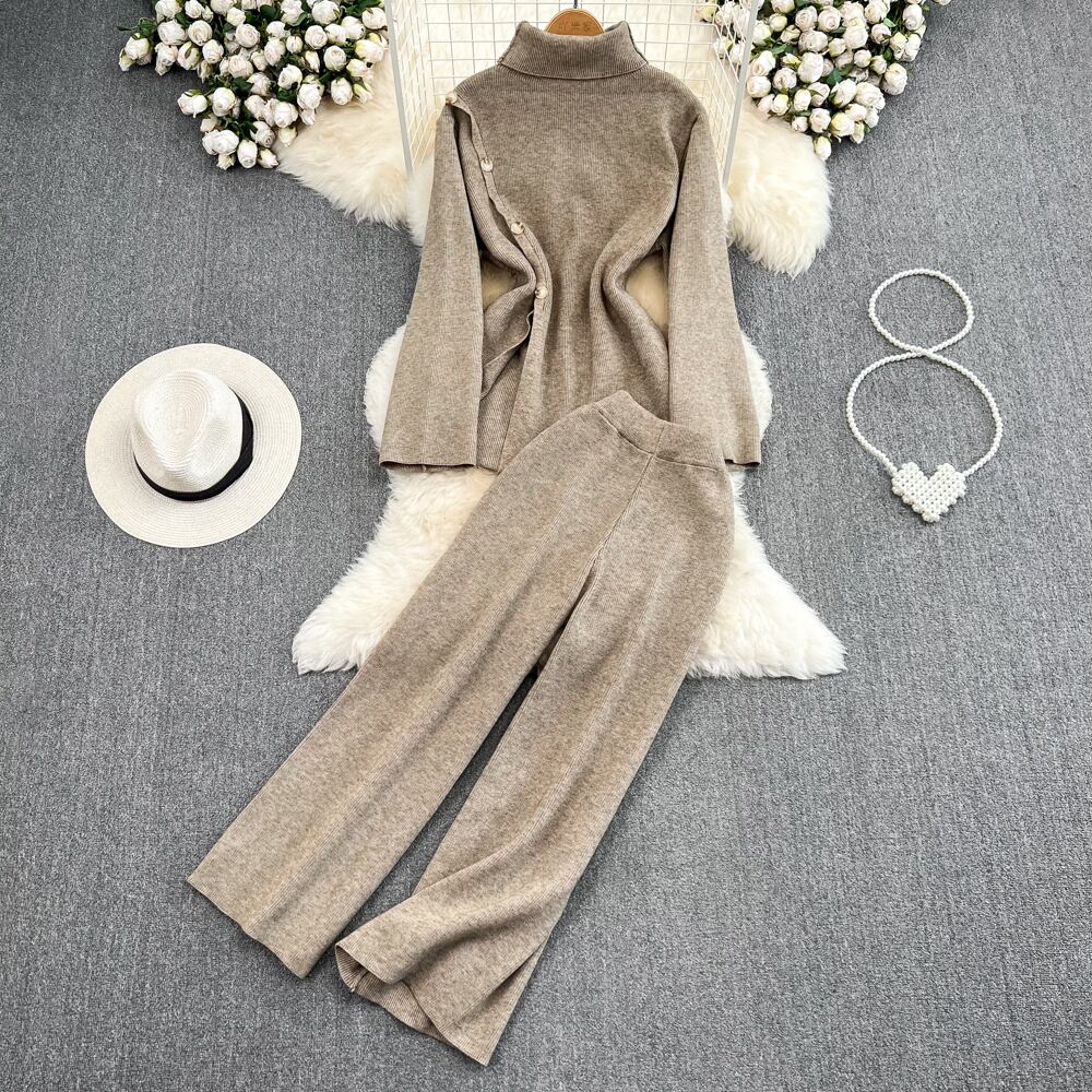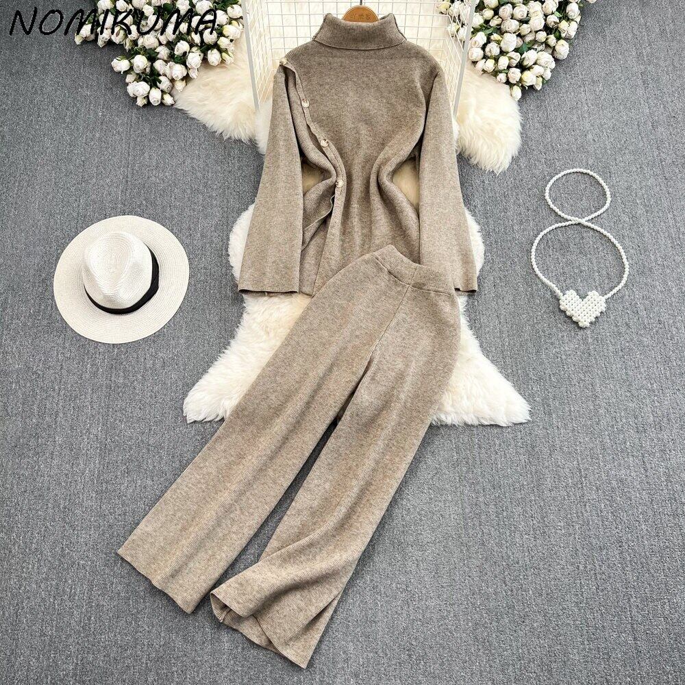 Nomikuma セット女性因果長袖スタンドネックニットセーター 2 個衣装ウエストロングセーターワイドレッグパンツ ワイドパンツ kor81362263534