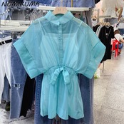 Nomikuma 2022 二枚の女性のドレスシフォンバットウィングスリーブスタンドアップカラーレースアップスリムウエストドレス + スリング Vestidos kor38979046983
