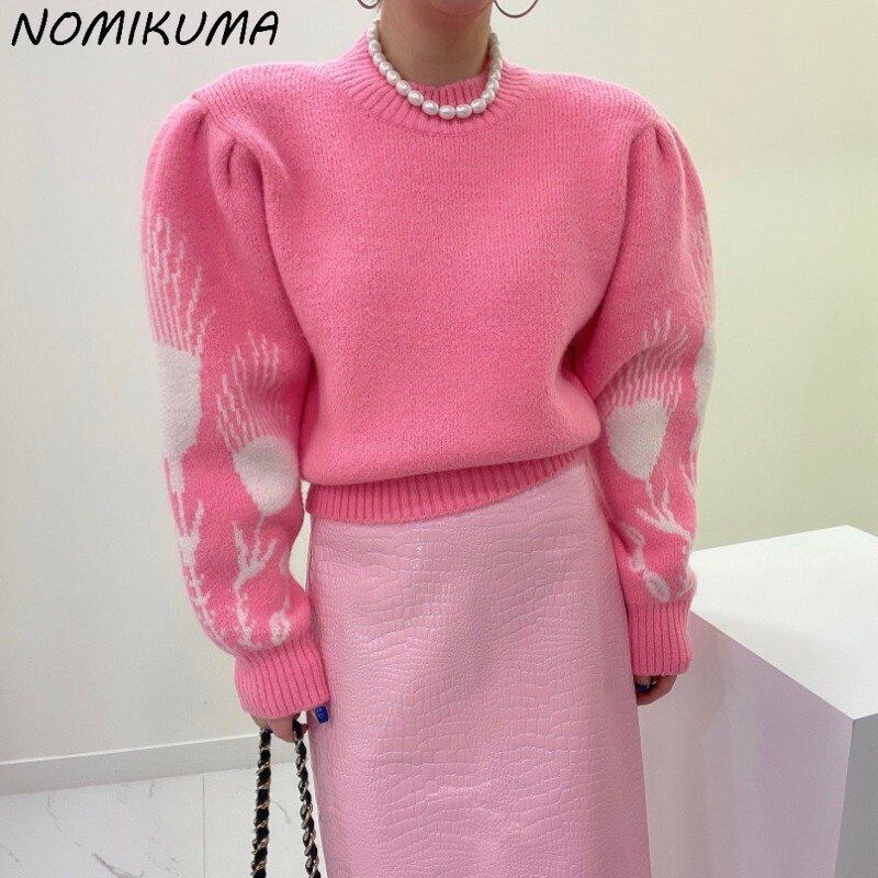 Nomikuma 幾何学模様パフスリーブセーター女性秋冬プル因果 O ネックニットプルオーバー オータム 秋物 ウィンター 冬物 Oネック kor36220057996