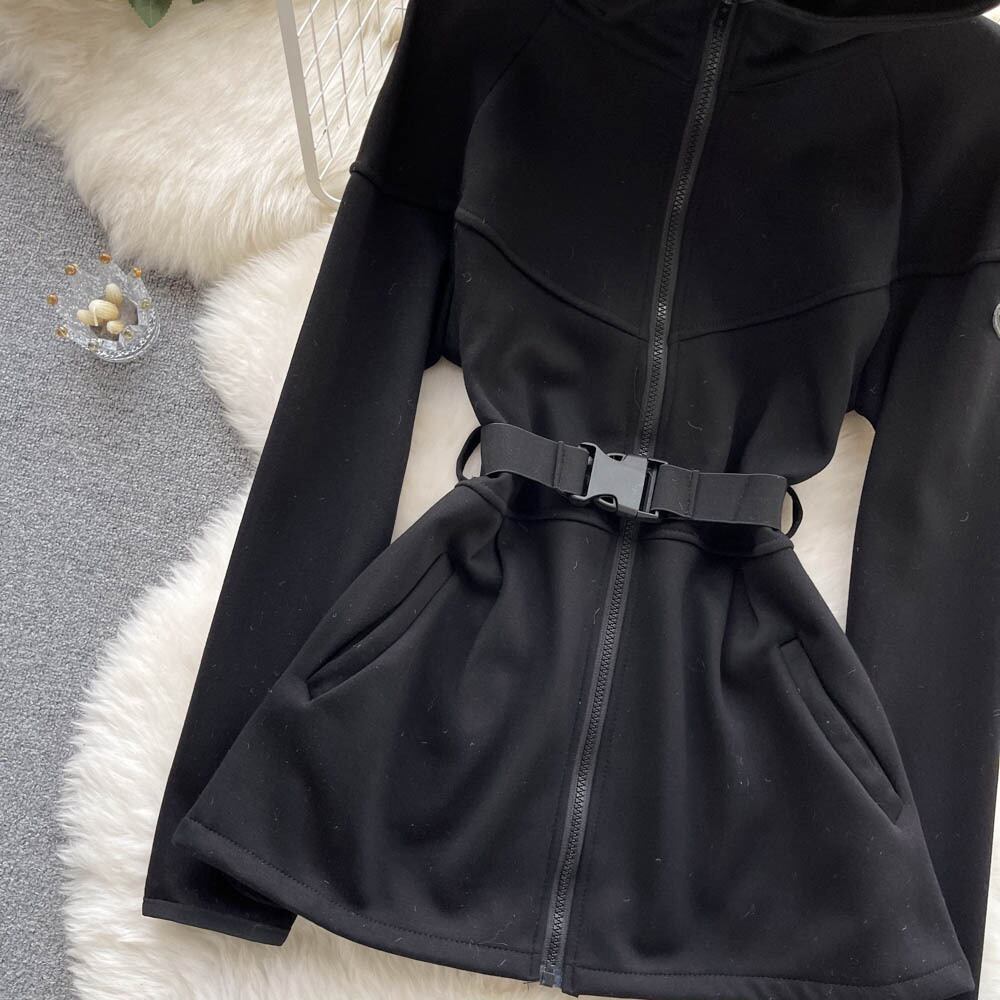 Nomikuma 2022 秋冬ミディアムロングジッパーフード付きセーターカーディガンコートコントラストカラーベルトスリムウエストパーカー オータム 秋物 ウィンター 冬物 ハーネス kor57819287554