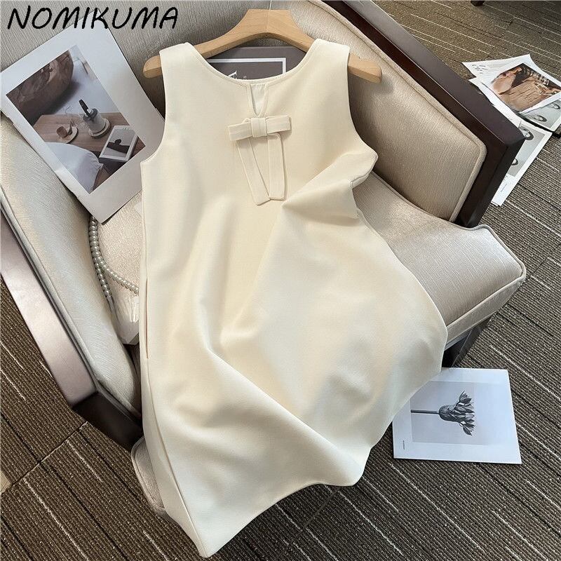 Nomikuma シックなちょう結び V ネック ノースリーブ ドレス夏 2022 因果無地タンク ドレス甘い A ライン Vestido デ リボン 大人ガーリー スウィート キュート カジュアル サマー 夏物 Vネック Aライン ソリッドカラー kor19536121951
