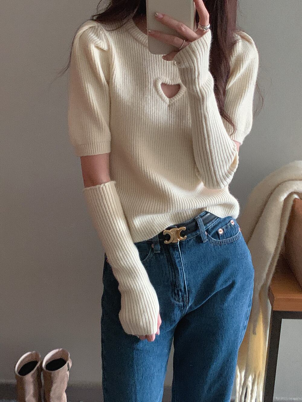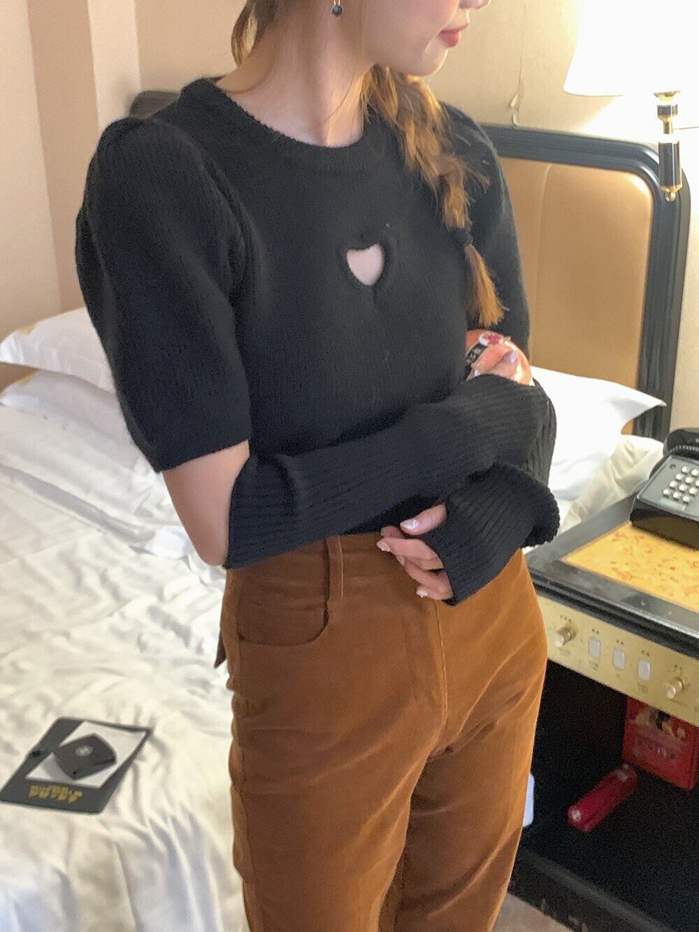 Nomikuma 秋冬シックラブハート中空アウトプルオーバーニットスウィートパフスリーブ O ネック 2022 ニットセーター 大人ガーリー キュート カジュアル オータム 秋物 ウィンター 冬物 Oネック kor47092329181