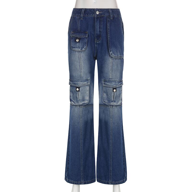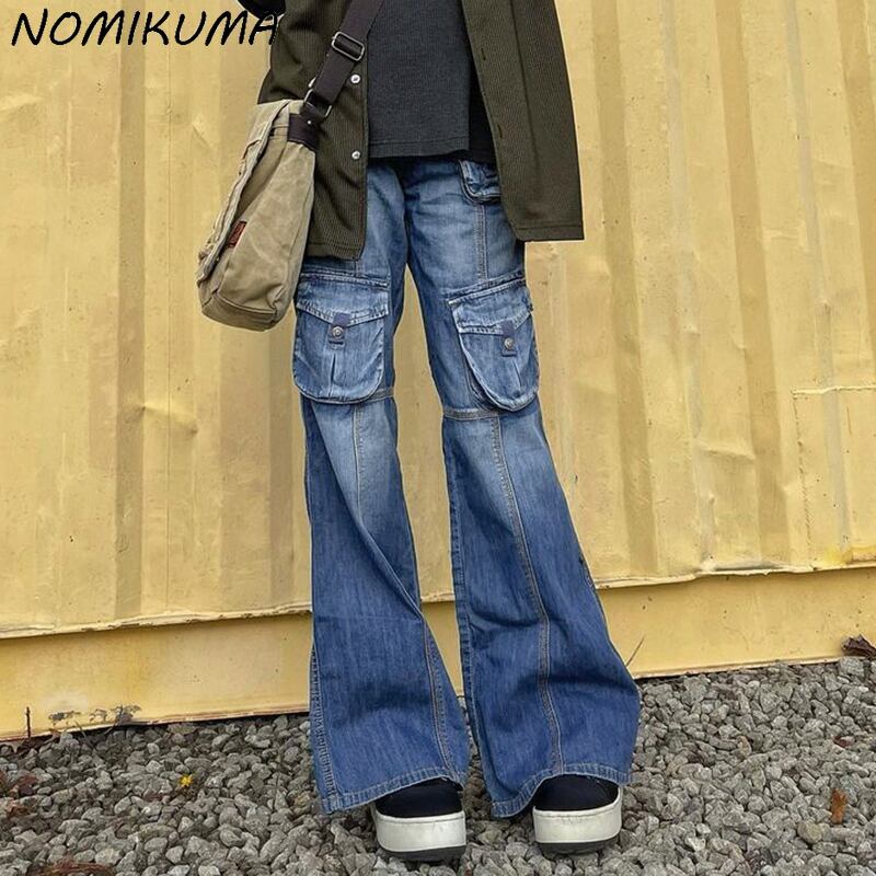 Nomikuma ストリートブルーポケットパッチワーク徳民フレアパンツ女性ウエスト長ズボン因果 2022 ジーンズパンツ ロング kor12812297382