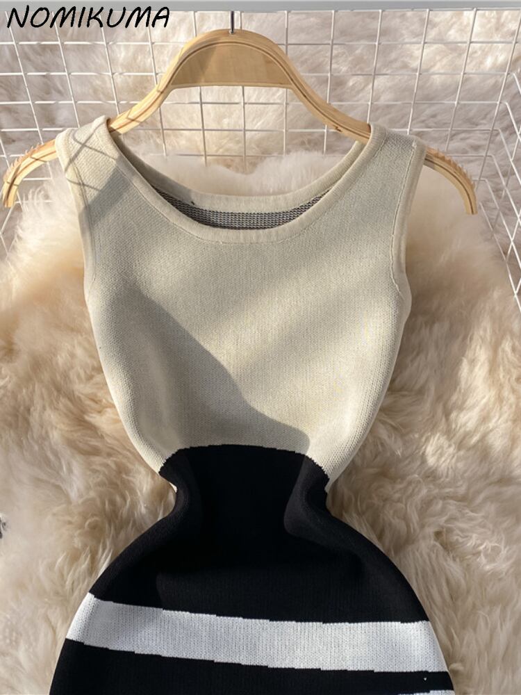 Nomikuma ストライプ プリント ニット シック ボディコン ドレス 気質 レトロ セクシー ロング 夏 レディース Oネック ノースリーブ サマー 夏物 kor74931051550