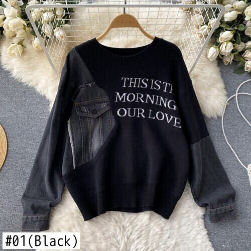 Nomikuma 偽二枚 Demin パッチワークニットスウェットシャツ女性ヒットカラー文字プルオーバー 2022 秋冬ジャンパー オータム 秋物 ウィンター 冬物 kor47981469011
