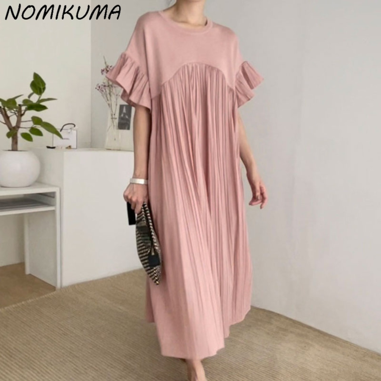 Nomikuma パッチワークプリーツドレス 2022 夏フレアスリーブ因果 O ネック女性ドレス Vestidos デ サマー 夏物 Oネック kor27288570303