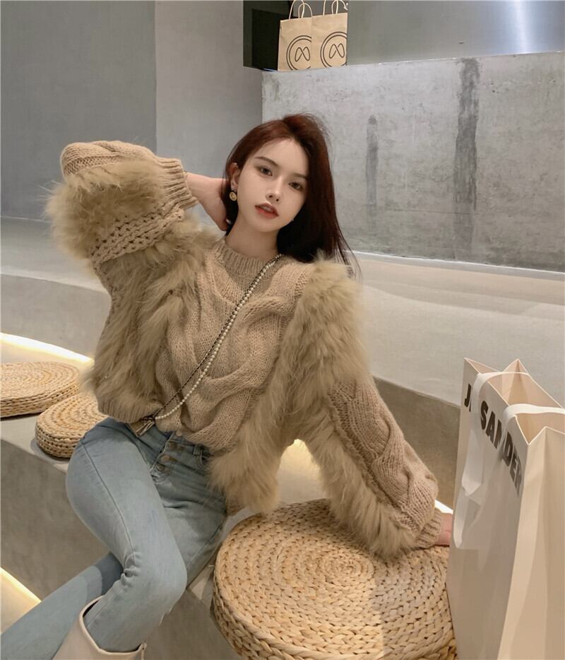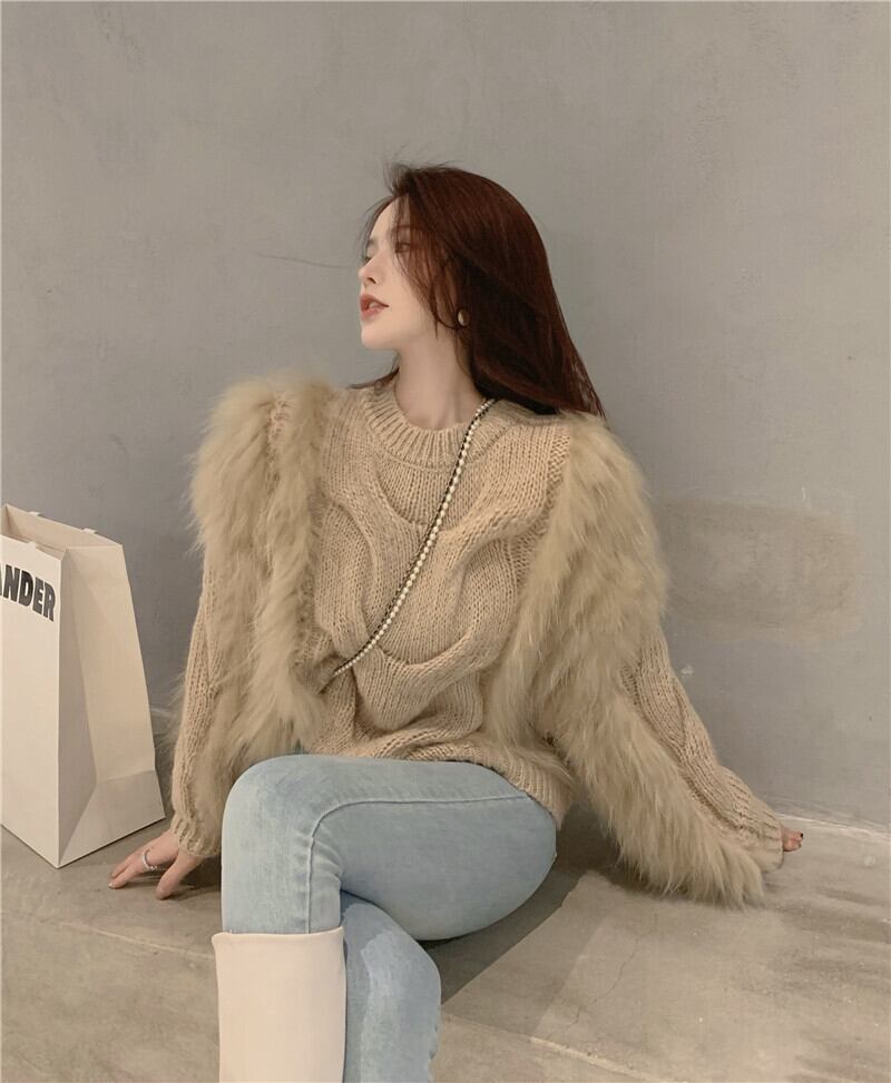 ノミクマ ファー パッチワーク プルオーバー ショート ニット セーター 2022秋冬 プルオーバー 長袖 Oネック ニット ロング オータム 秋物 ウィンター 冬物 kor51177240018