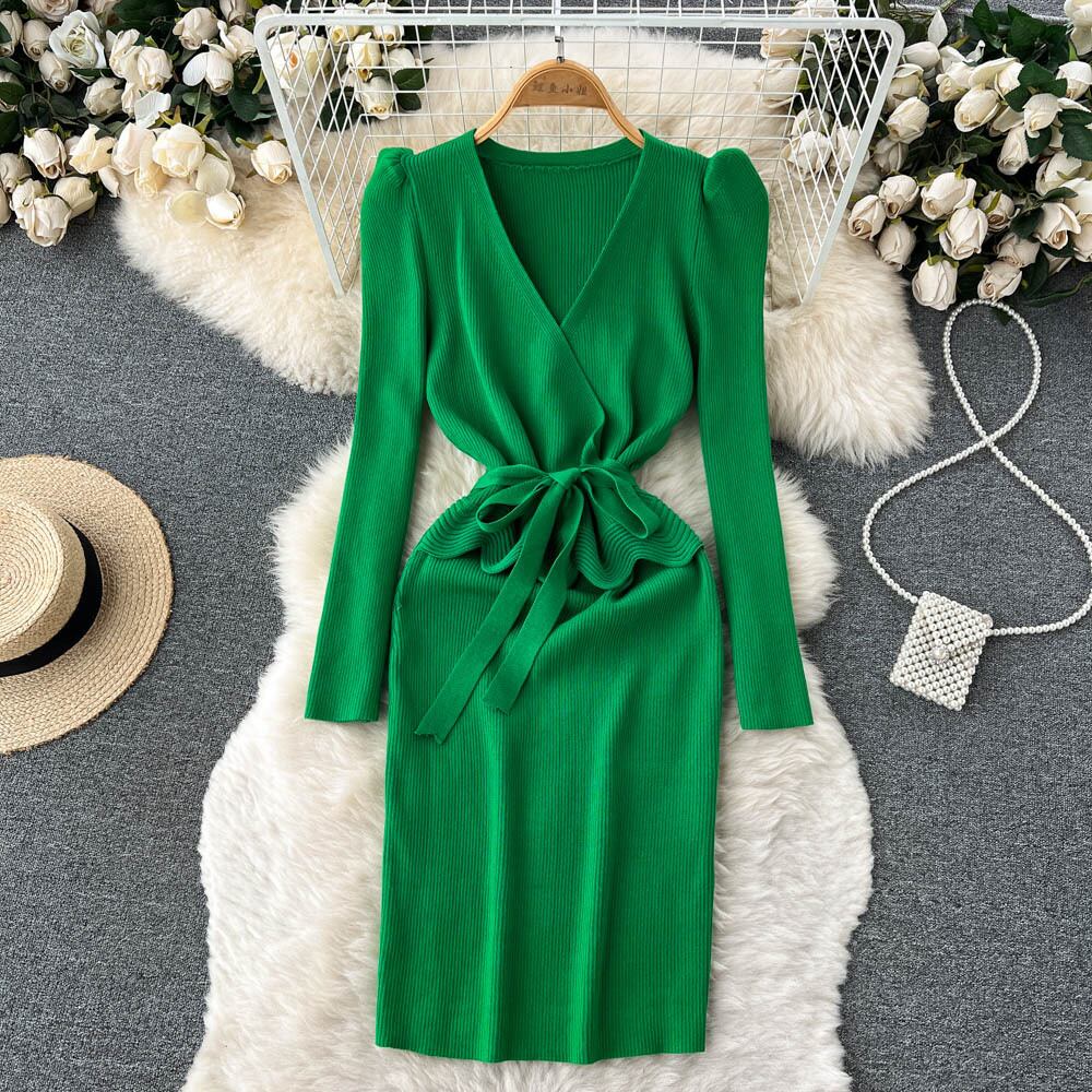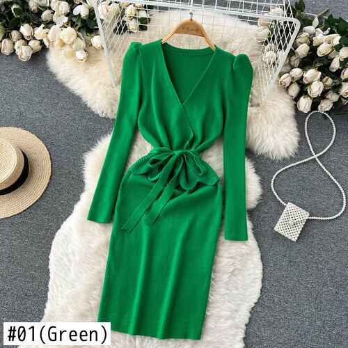 Nomikuma V ネックパフ長袖ニットドレス弓包帯スリムウエストベーシックボディコーンローブ 2022 セーター Vestidos ロング リボン Vネック kor10513152122