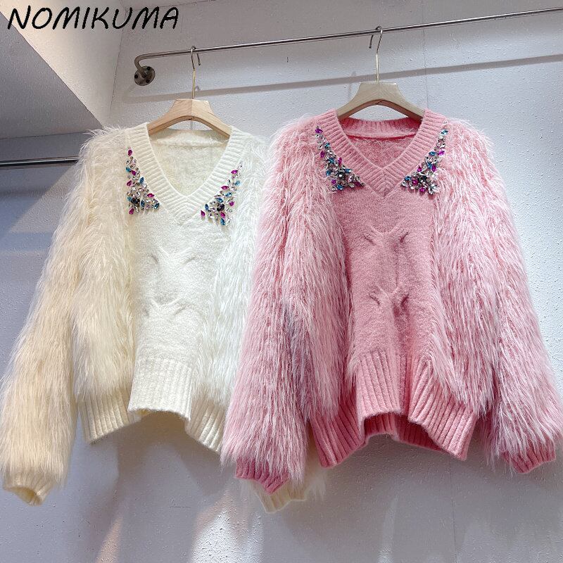 Nomikuma プルダイヤモンドファーパッチワークセーター女性 2022 秋冬因果長袖 V ネックプルオーバーニット ロング オータム 秋物 ウィンター 冬物 Vネック kor15522010004