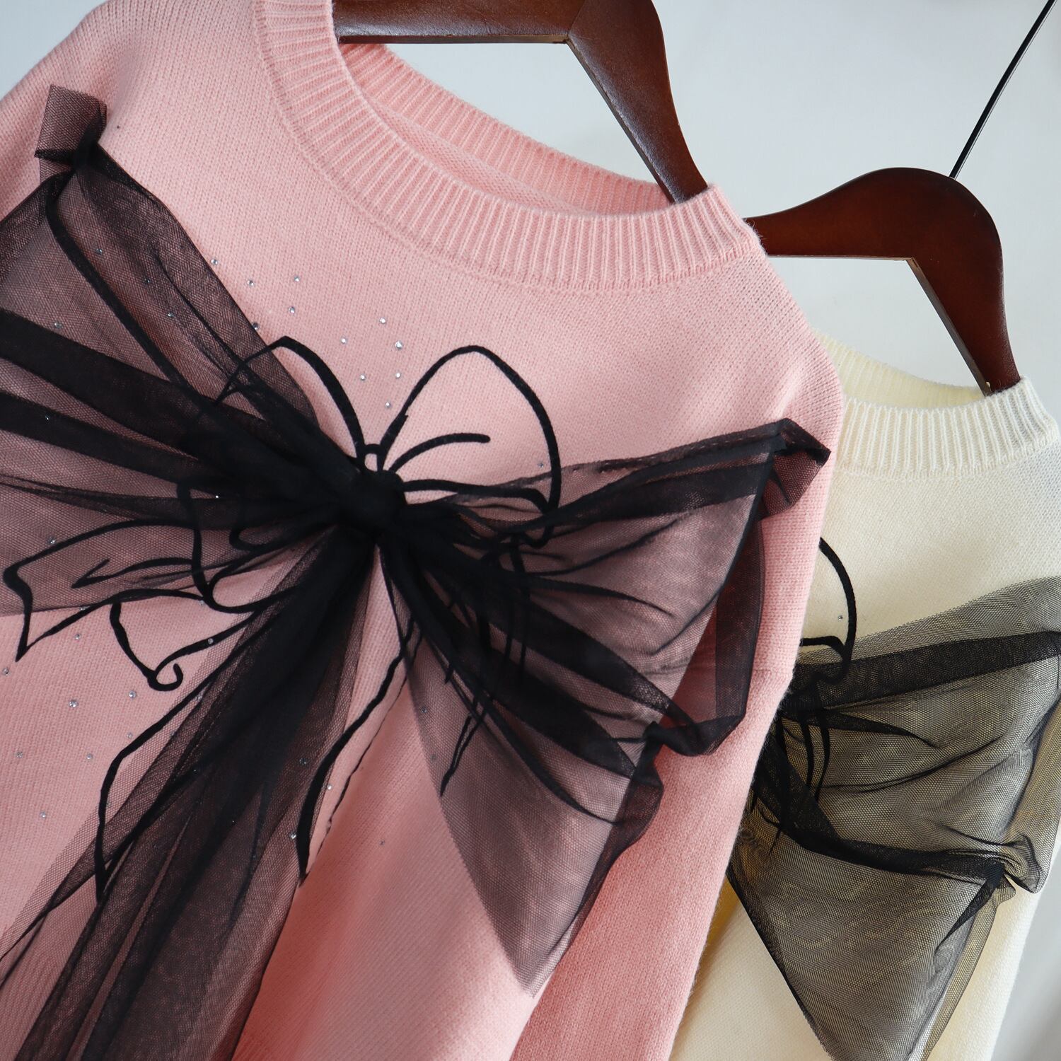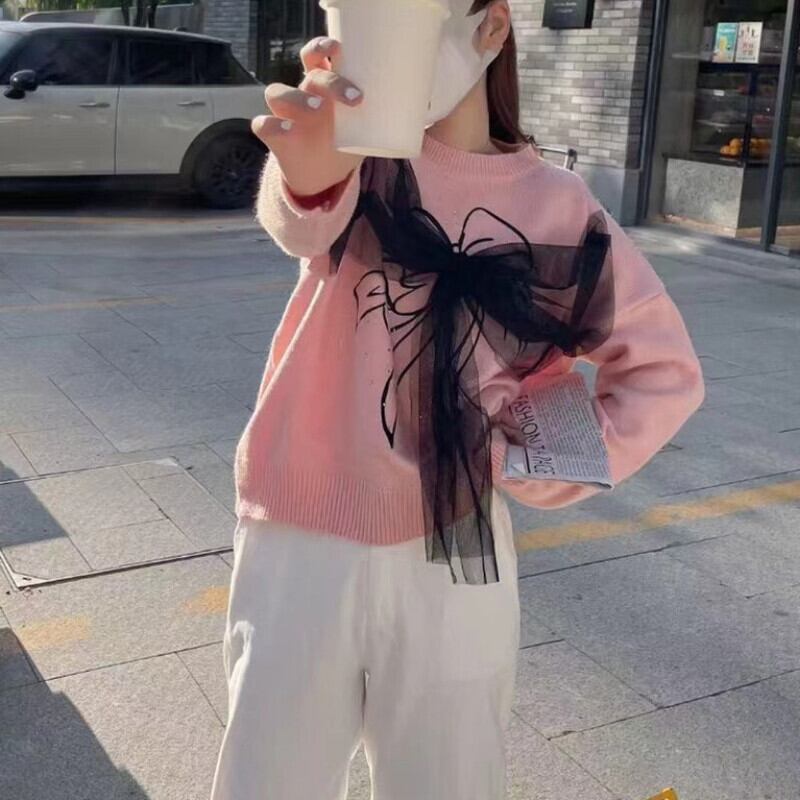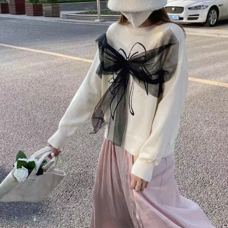 Nomikuma 甘いメッシュちょう結びニットトップス女性 2022 秋冬プル因果長袖 O ネックプルオーバーニットセーター ロング リボン 大人ガーリー スウィート キュート カジュアル オータム 秋物 ウィンター 冬物 Oネック kor3950868262