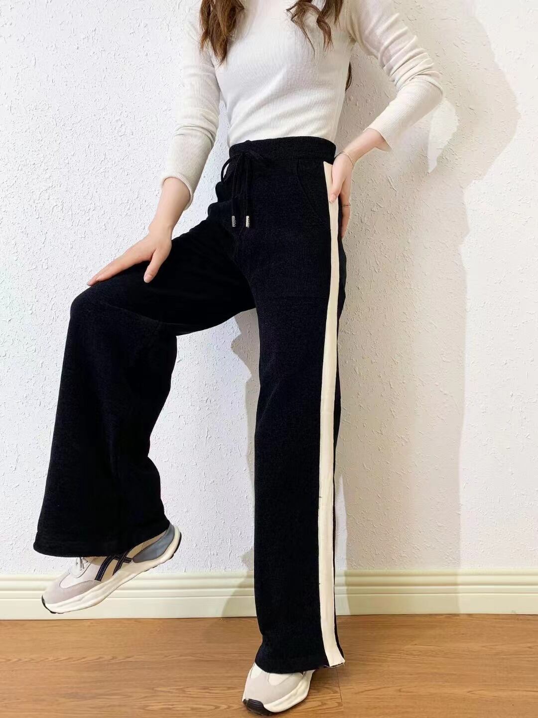 Nomikuma 2022 秋冬セーターパンツレースアップウエスト長ズボン因果コントラストカラーニットワイドレッグパンツ ロング オータム 秋物 ウィンター 冬物 ワイドパンツ kor21650864874