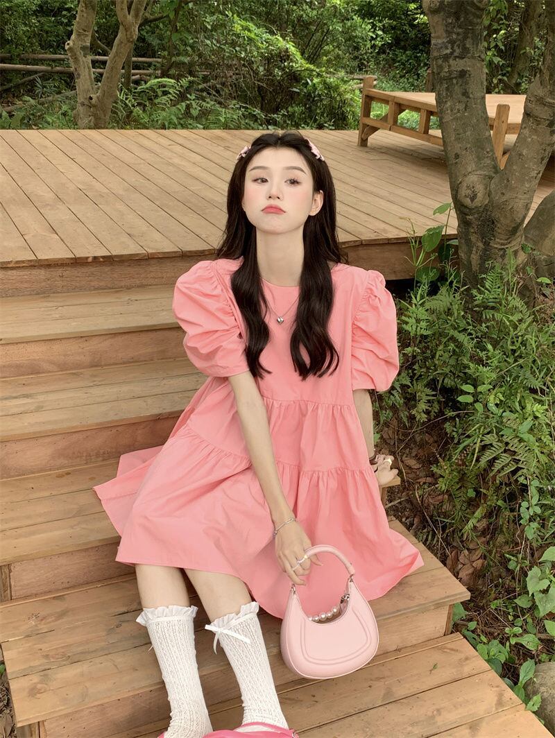 Nomikuma 2022 夏ドレス女性シックなパフスリーブ O ネック Vestidos 因果無地 A ライン甘い 大人ガーリー スウィート キュート カジュアル サマー 夏物 Oネック Aライン ソリッドカラー kor2355882920