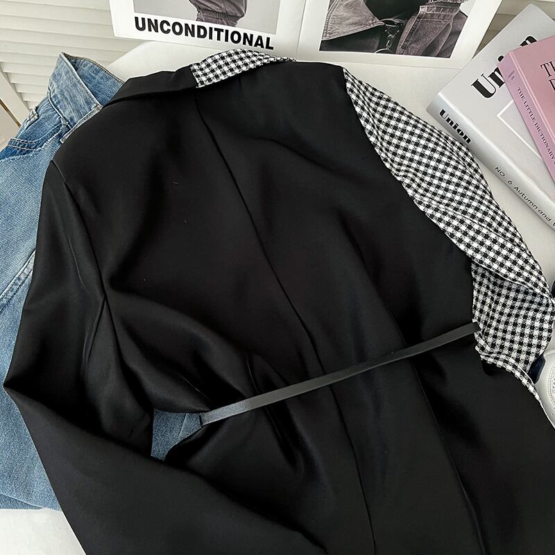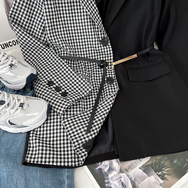 ノミクマ コントラストカラーチェック柄長袖ブレザーコートベルトスリムウエストミディアムロングスーツジャケット2022秋ブレザー オータム 秋物 ハーネス kor62560265160