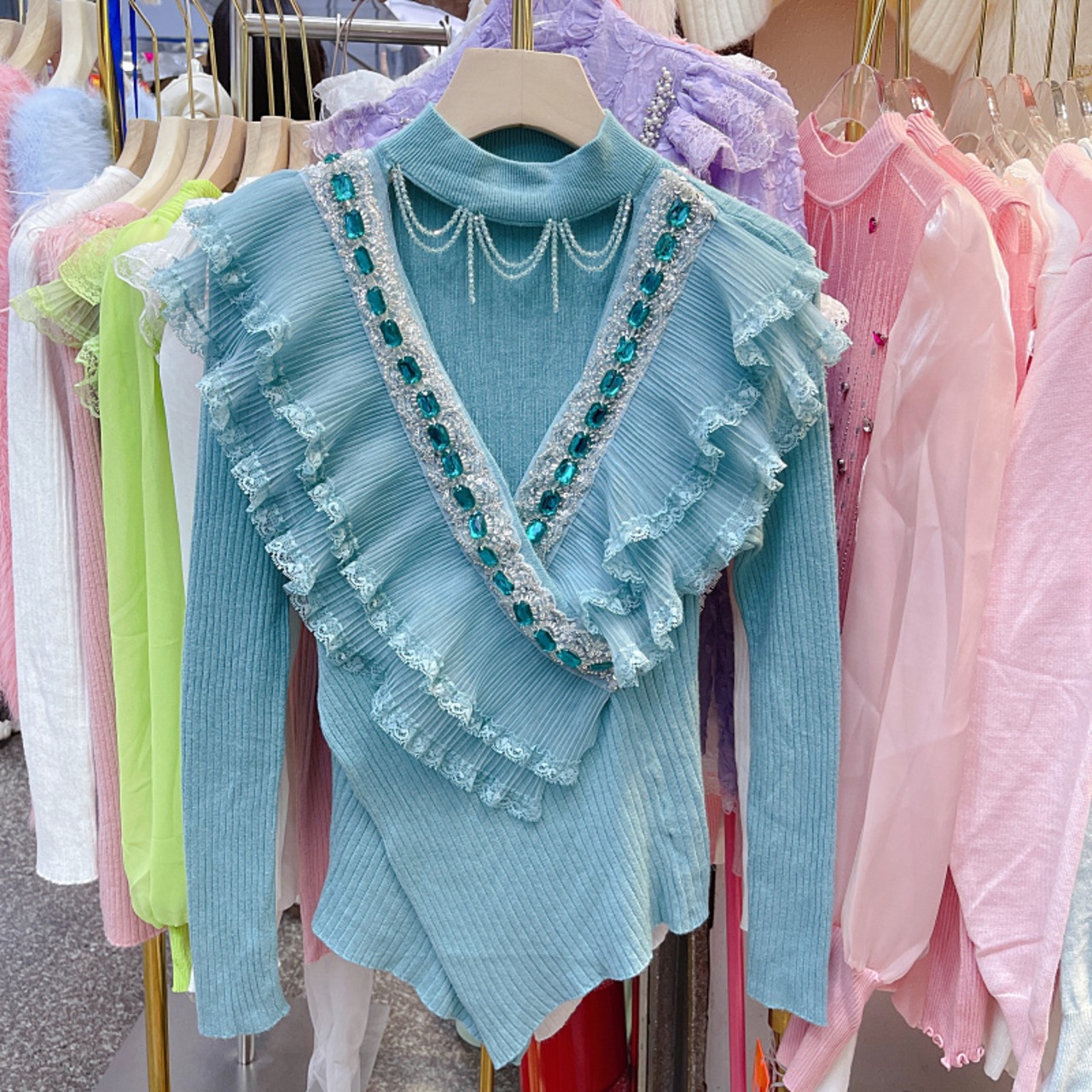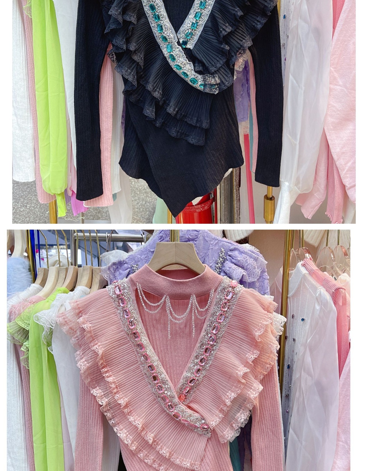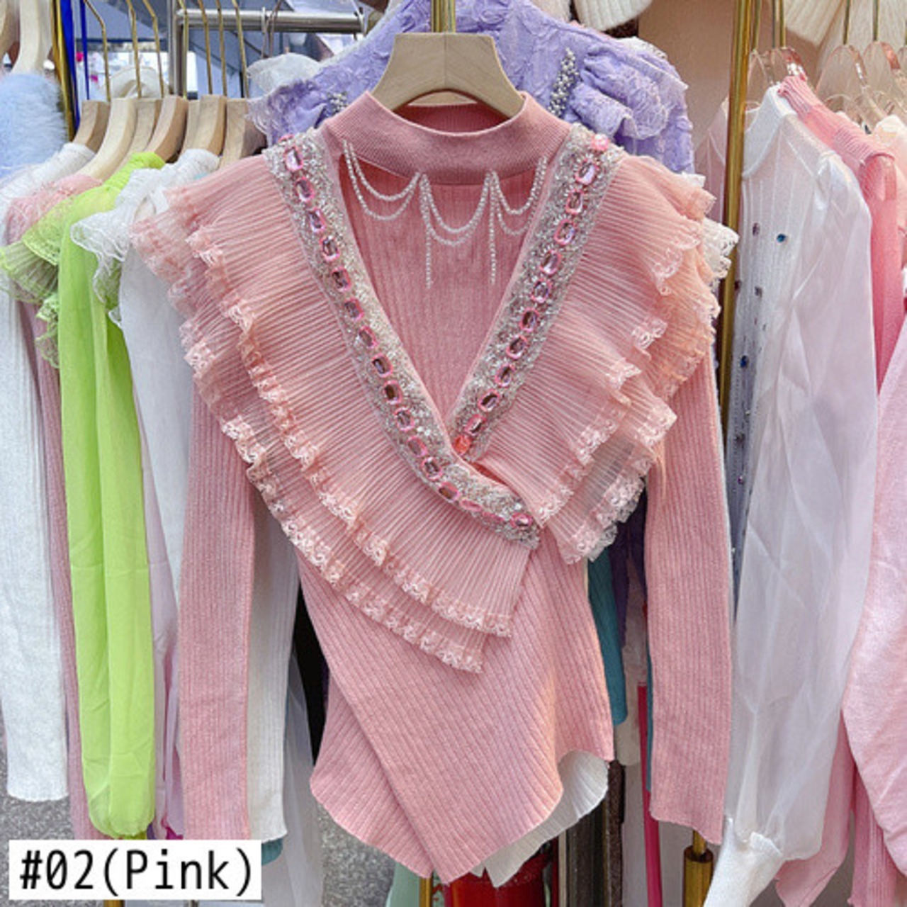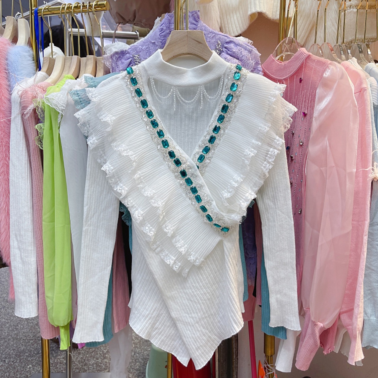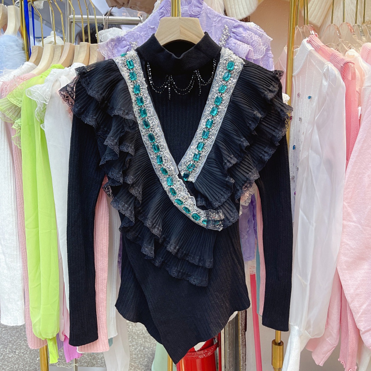 ノミクマ ビーズくり抜きOネックセーター ダイヤ フリル パッチワーク ニット 2022秋冬 ニットトップス オータム 秋物 ウィンター 冬物 kor6778205319