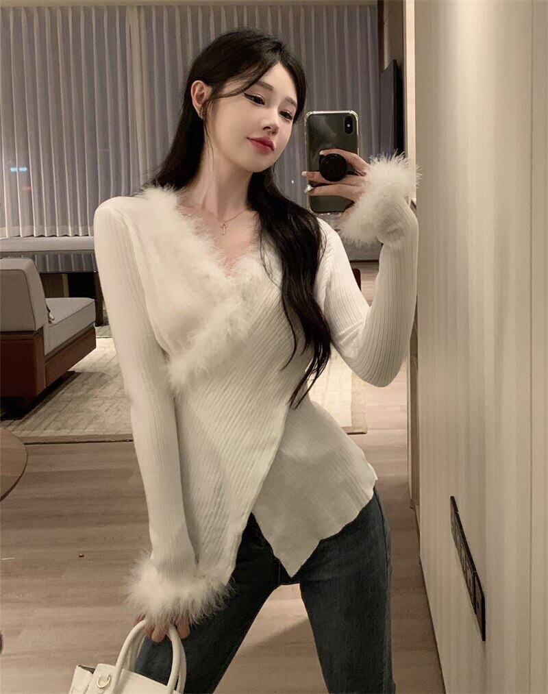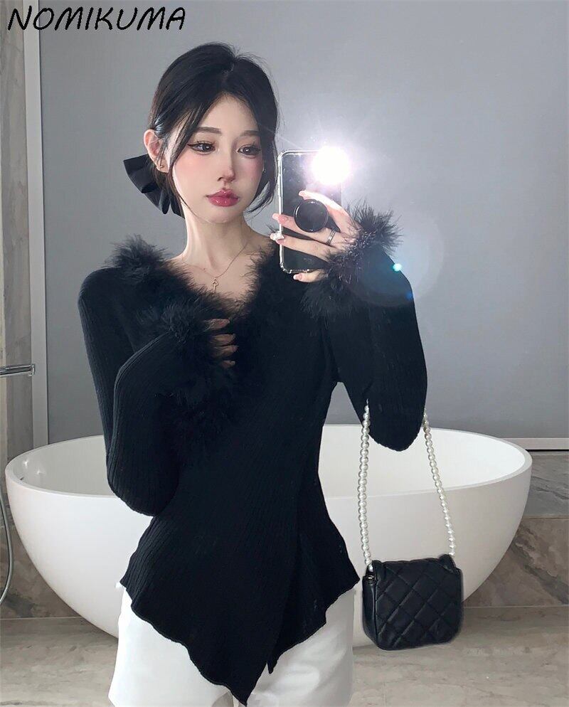 ノミクマ ファー パッチワーク Vネック イレギュラー スリム ウエスト ストレッチ ニット 2022秋冬 ニット ボトムス セーター オータム 秋物 ウィンター 冬物 kor54086002473