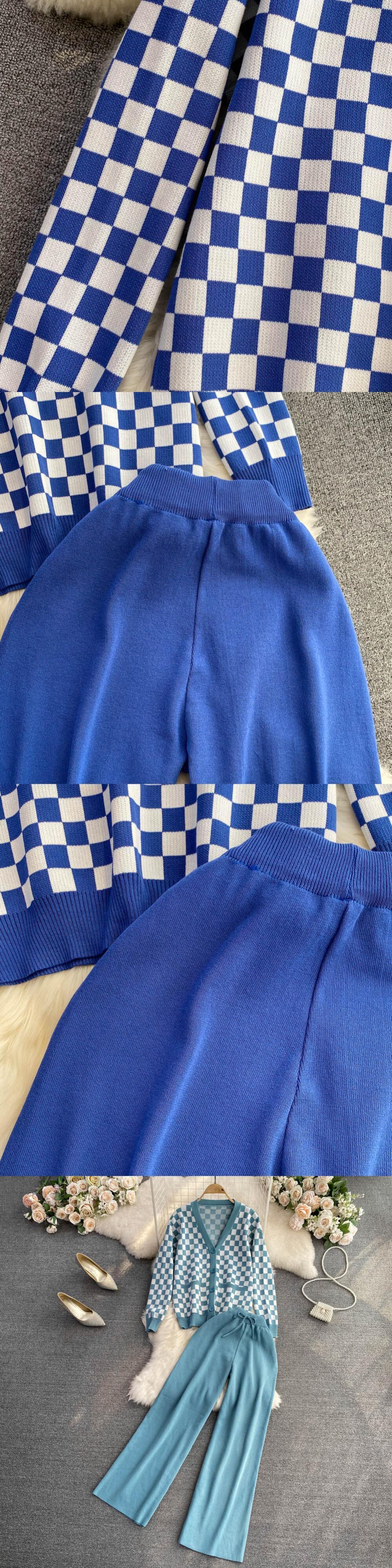ノミクマセット カジュアルVネック長袖ニットカーディガン+レースアップウエストワイドレッグロングセーターパンツ ニットスーツ ワイドパンツ kor70119858075