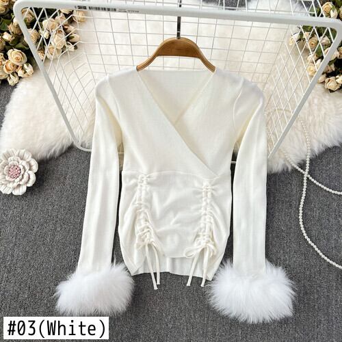 Nomikuma セクシーなクロス V ネック巾着ストレッチニット女性スリムショートグラフィック Tシャツ毛皮パッチワーク長袖 Tシャツトップス ロング Vネック kor62626036272