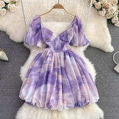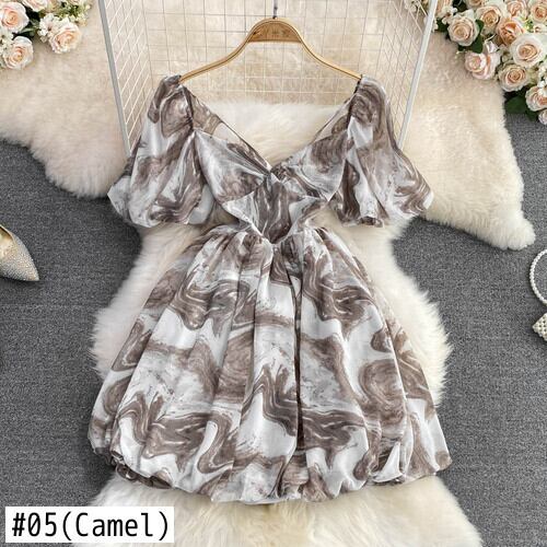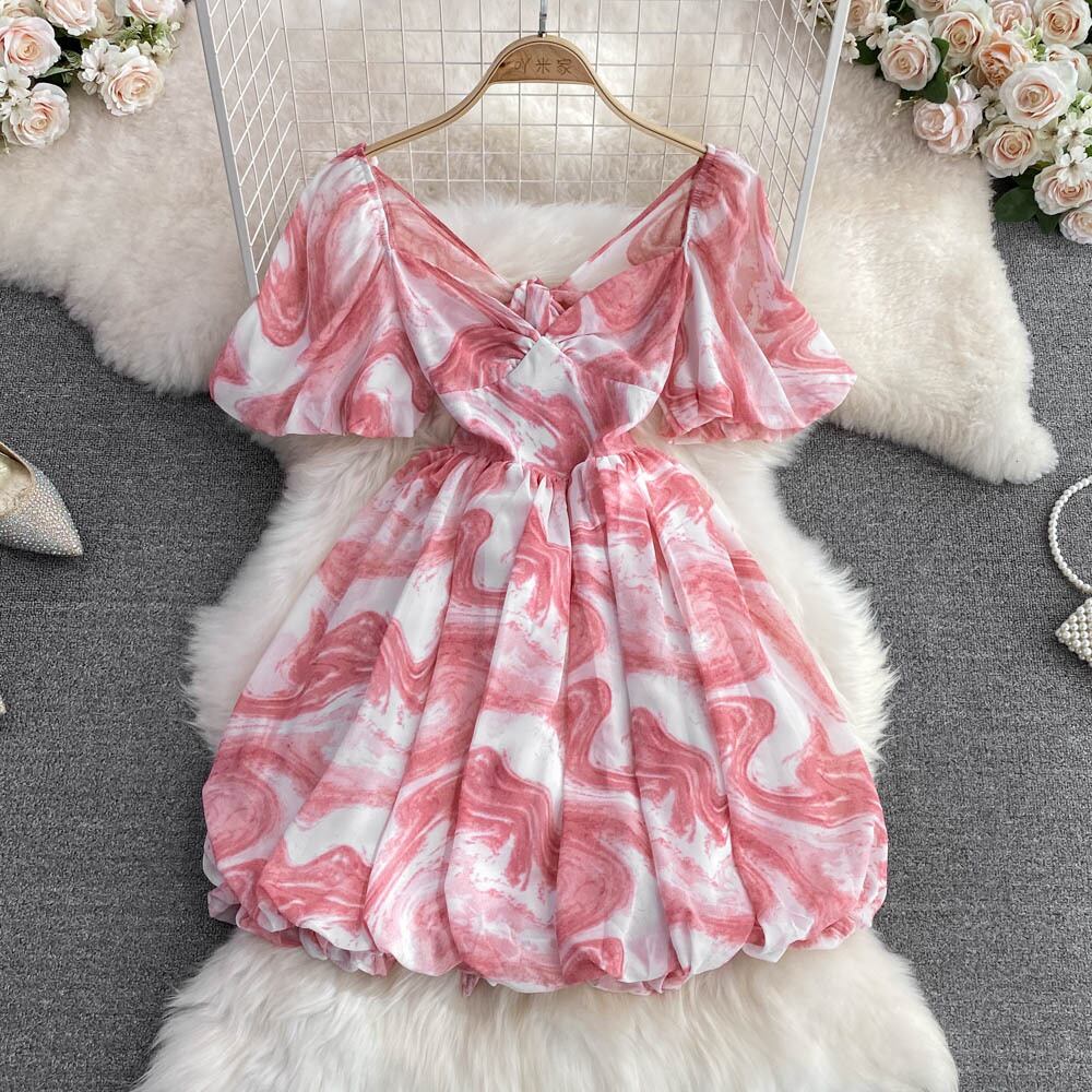 Nomikuma スウィート V ネックパフスリーブ印刷ドレス女性のセクシーな弓包帯背中の開いたドレス 2022 夏ウエスト Vestidos リボン 大人ガーリー キュート カジュアル サマー 夏物 Vネック kor34912148445