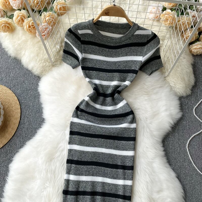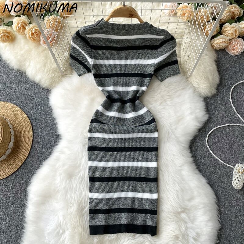 Nomikuma 半袖ニットドレス夏の女性 2022 スリム Bodycorn ドレスコントラストカラーストライプセーター Vestidos ショート ハーフスリーブ サマー 夏物 kor94577240490
