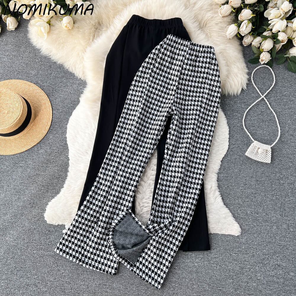Nomikuma 鳥格子女性パンツ弾性ウエスト長ズボン因果秋冬 2022 フレアパンツ ロング エラスティック 伸縮 オータム 秋物 ウィンター 冬物 kor58293269613