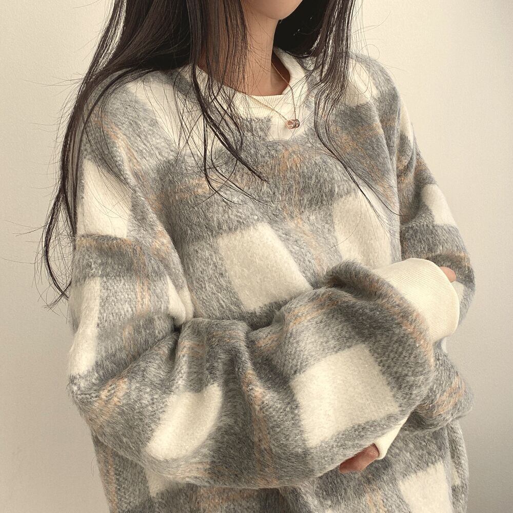 Nomikuma シックな秋冬ヒットカラーチェック柄プルオーバースウェットシャツ因果長袖 O ネック 2022 女性ウールパーカー ロング オータム 秋物 ウィンター 冬物 Oネック kor33787326606