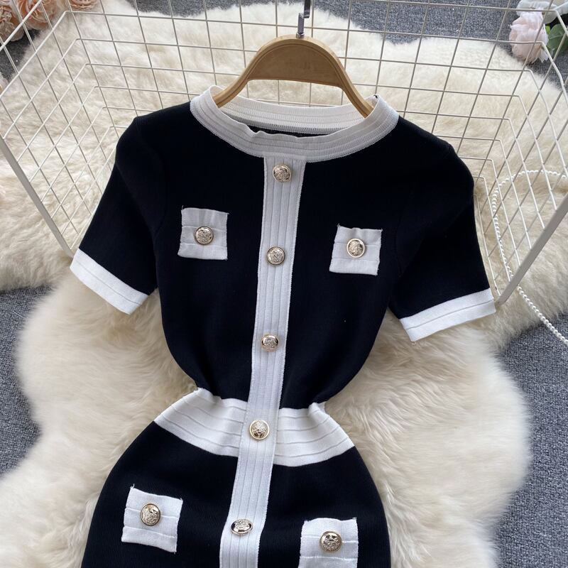 ノミクマ ヒットカラー ニット ストレッチワンピース 半袖 Oネック サマーセーターワンピース スリムボディコーン Vestidos ショート ハーフスリーブ 夏物 ドレス kor84676917474
