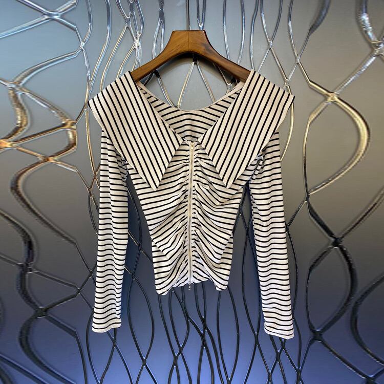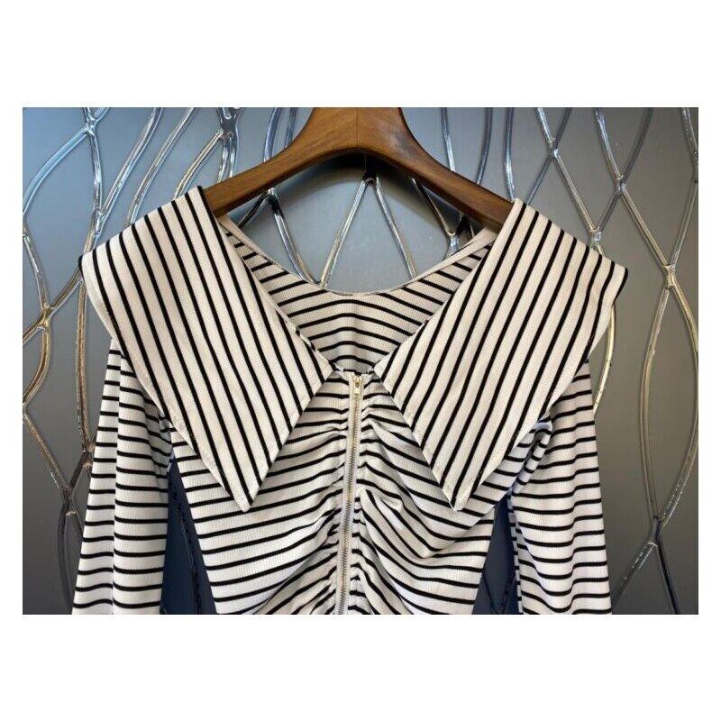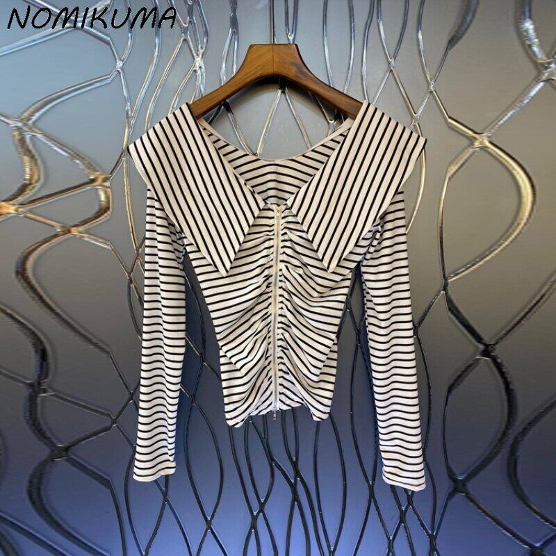 Nomikuma セーラー襟ダブル Zipeprs ストライプニット Tシャツ女性 2022 秋のセクシーなスリム長袖グラフィック Tシャツ ロング オータム 秋物 kor7895326890