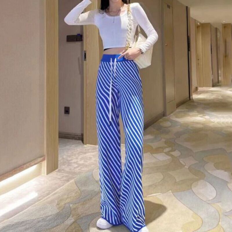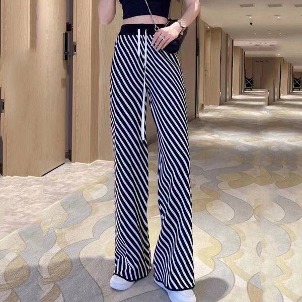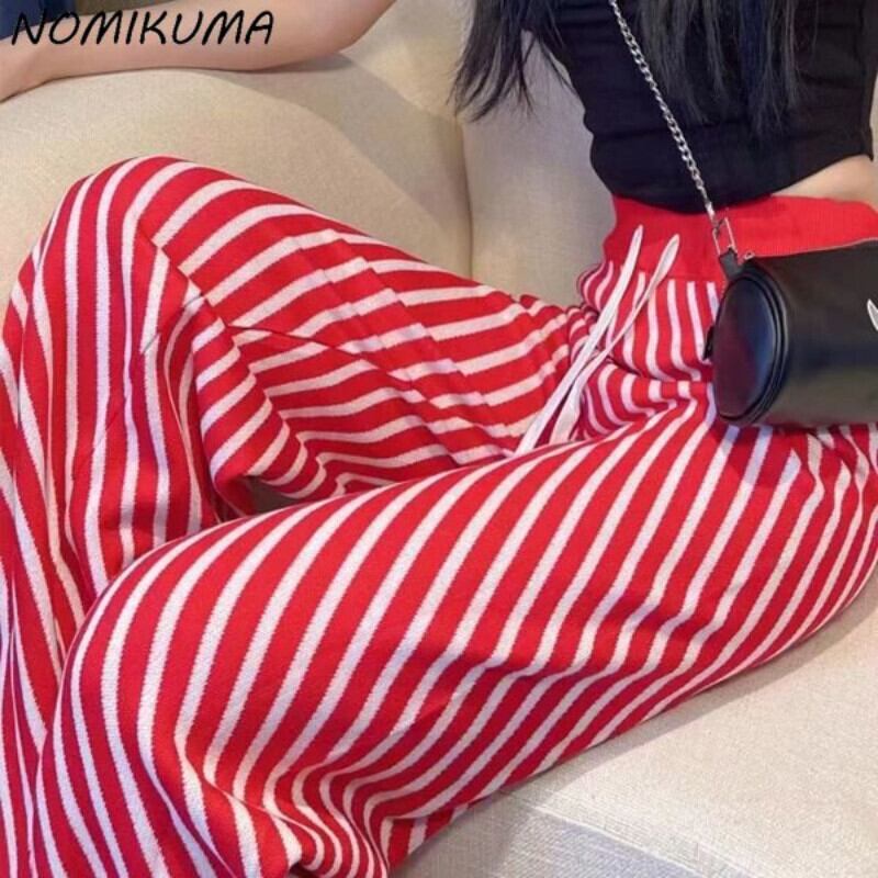Nomikuma ストライプニットワイドレッグパンツ女性 2022 秋冬長ズボンレースアップウエストセーターパンツ ロング オータム 秋物 ウィンター 冬物 ワイドパンツ kor41646538738