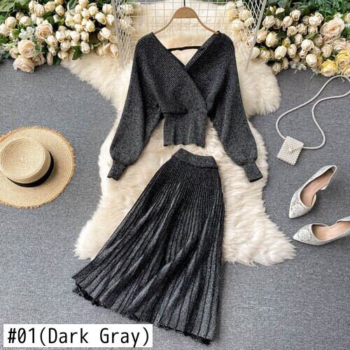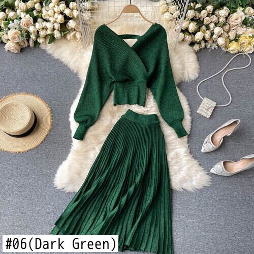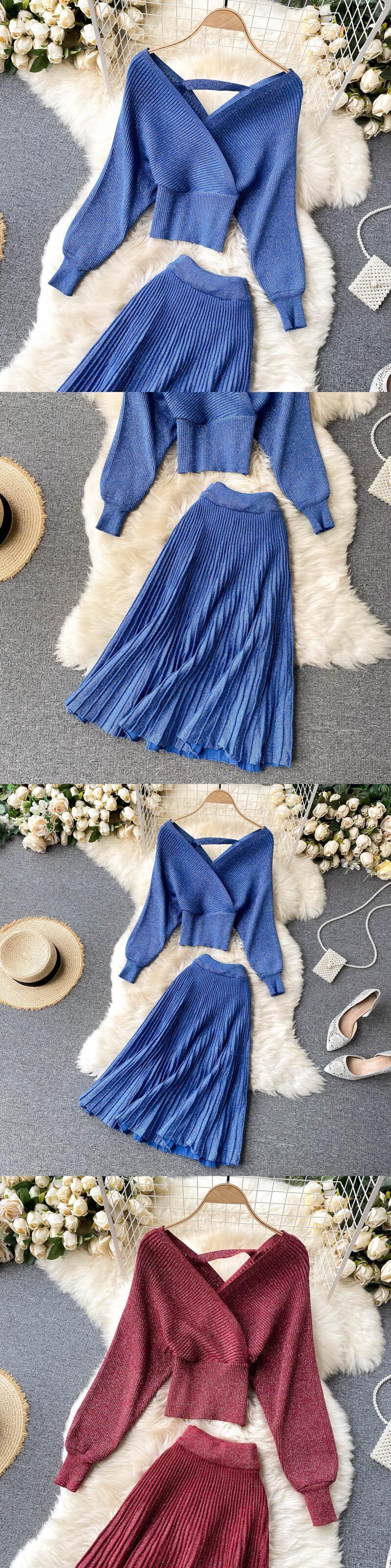 Nomikuma レディース セット クロス Vネック パフスリーブ ショート スリム ウエスト トップス + ウエスト カジュアル Aライン プリーツ スカート 2枚 kor20161048025
