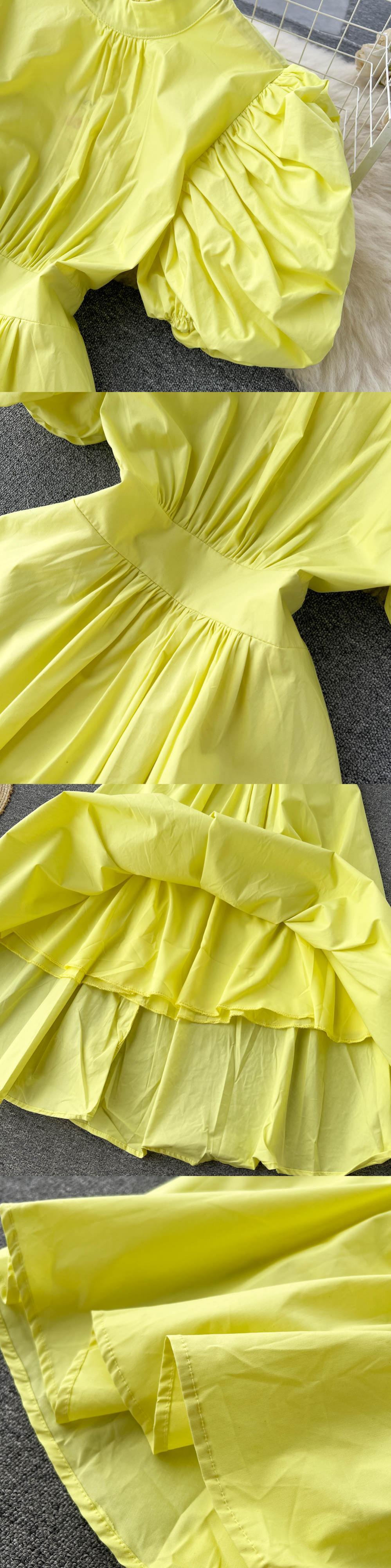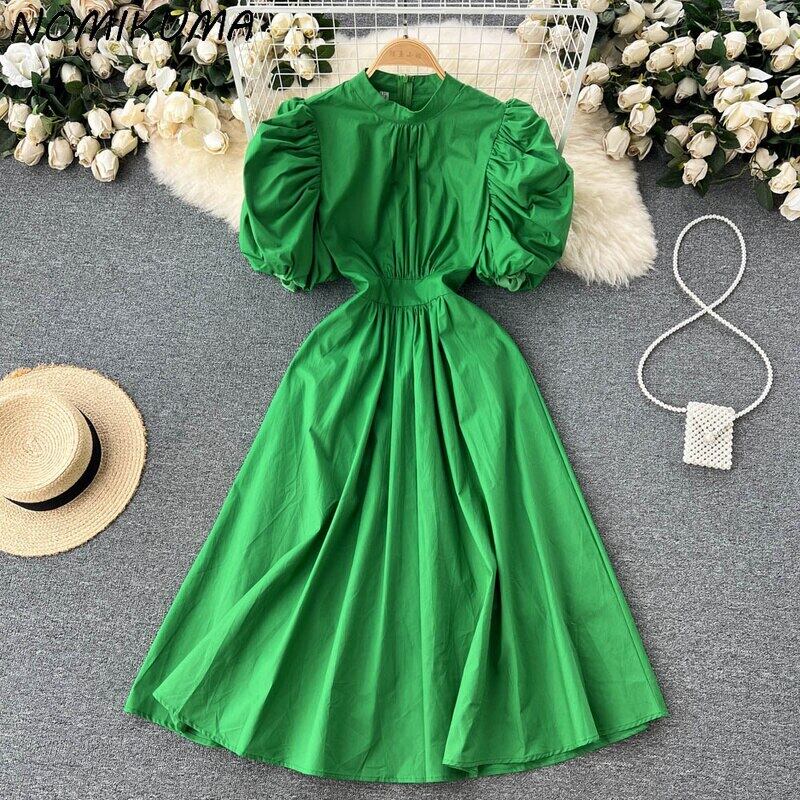 ノミクマ 無地 スタンドネック パフスリーブ ワンピース スリムウエスト Aライン Vestidos 2022年 夏 無地 ワンピース サマー 夏物 ドレス ソリッドカラー kor6620773804