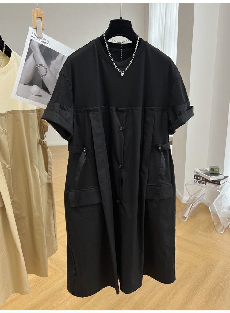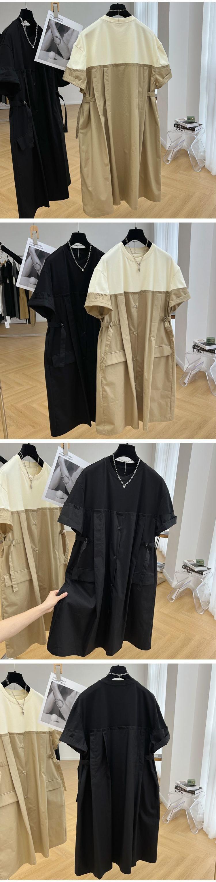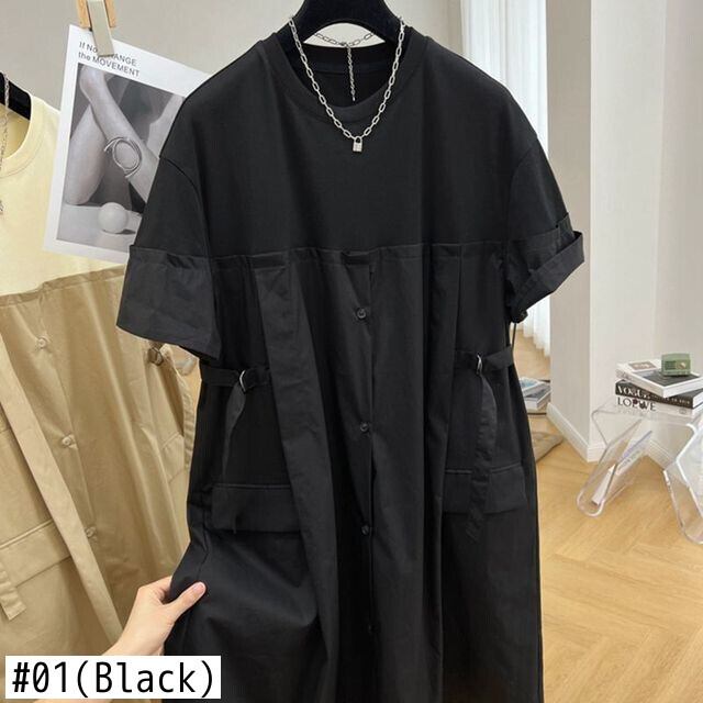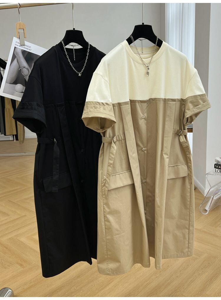 Nomikuma 夏パッチワークサファリスタイルドレス女性因果半袖 O ネックドレスレースアップストレート Vestidos デ ショート ハーフスリーブ サマー 夏物 Oネック kor94294208181