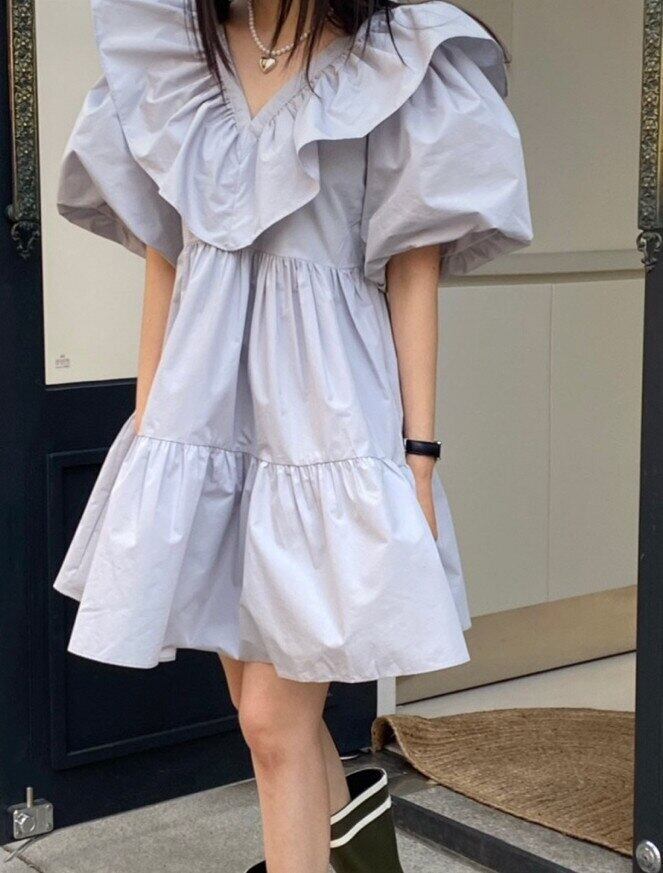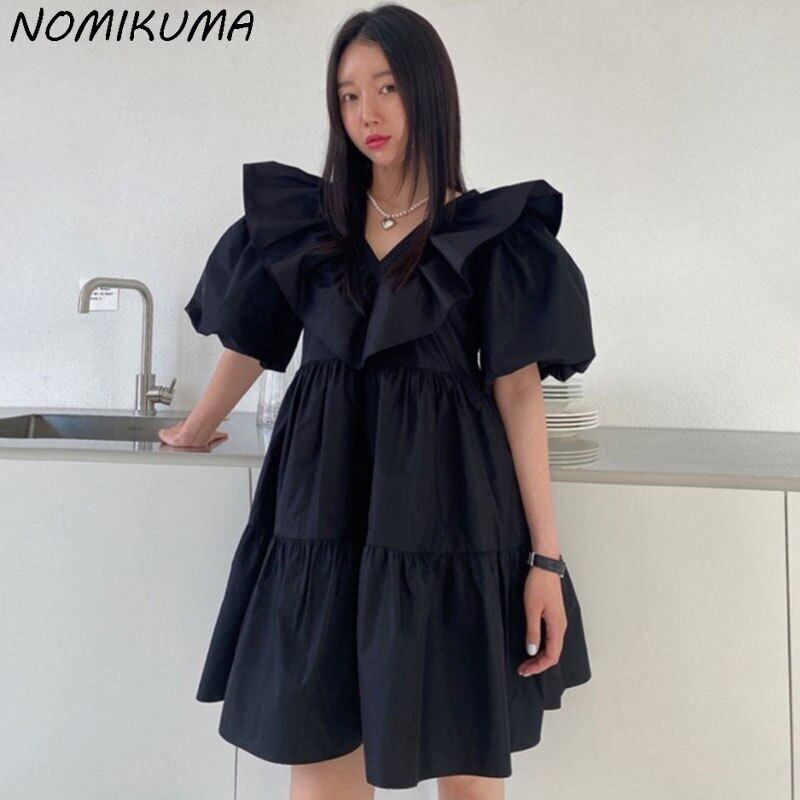 Nomikuma シックな夏フリル V ネックドレス女性ランタンスリーブ Vestidos 2022 因果 A ラインドレス サマー 夏物 Vネック Aライン kor35933860978