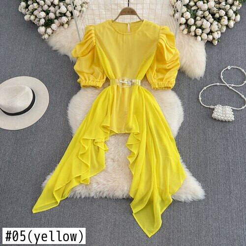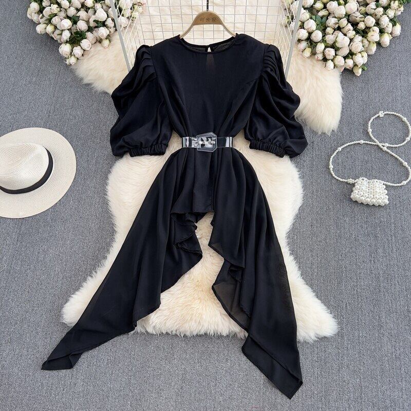 Nomikuma 2022 夏因果不規則なドレス女性ベルトスリムウエストドレスシックなパフスリーブ O ネック Vestidos サマー 夏物 ハーネス Oネック kor85184203262