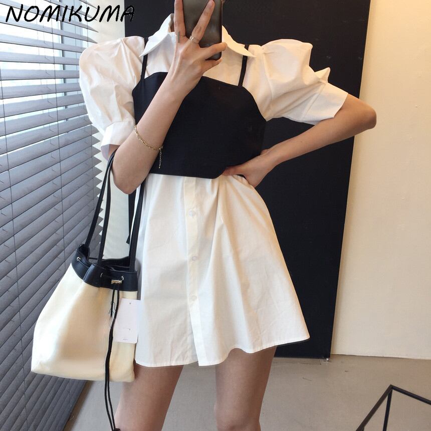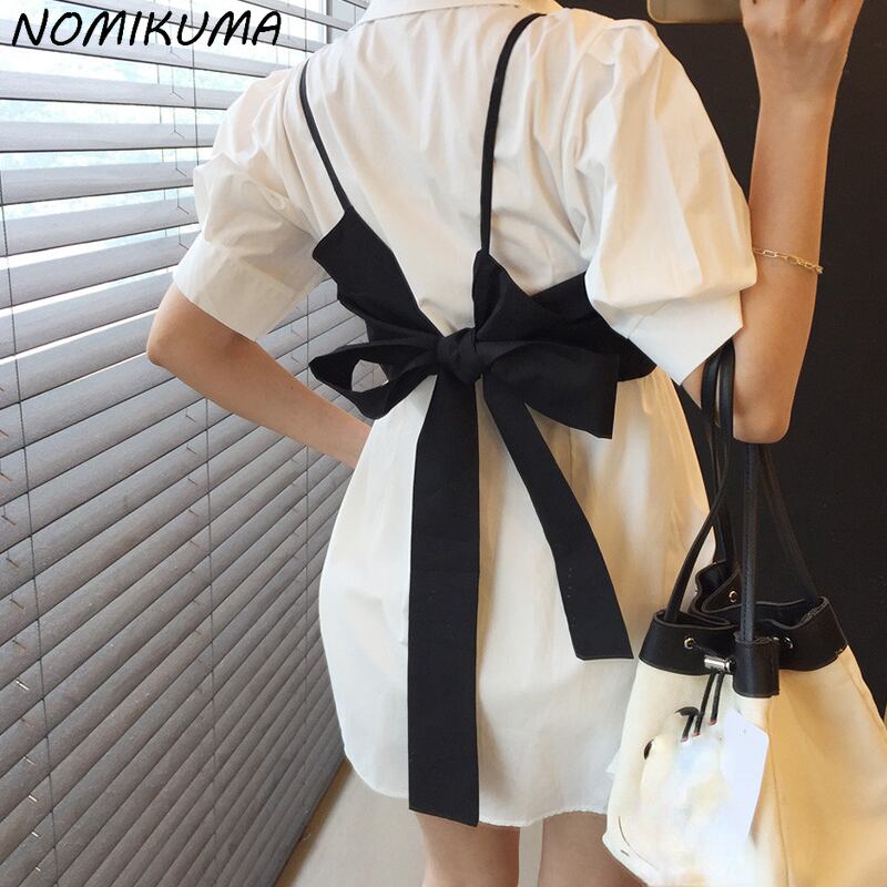 Nomikuma シックなツーピース女性ドレスセットパフスリーブターンダウンカラーブラウスドレス + 弓包帯スリングベスト 2022 リボン kor7724878363