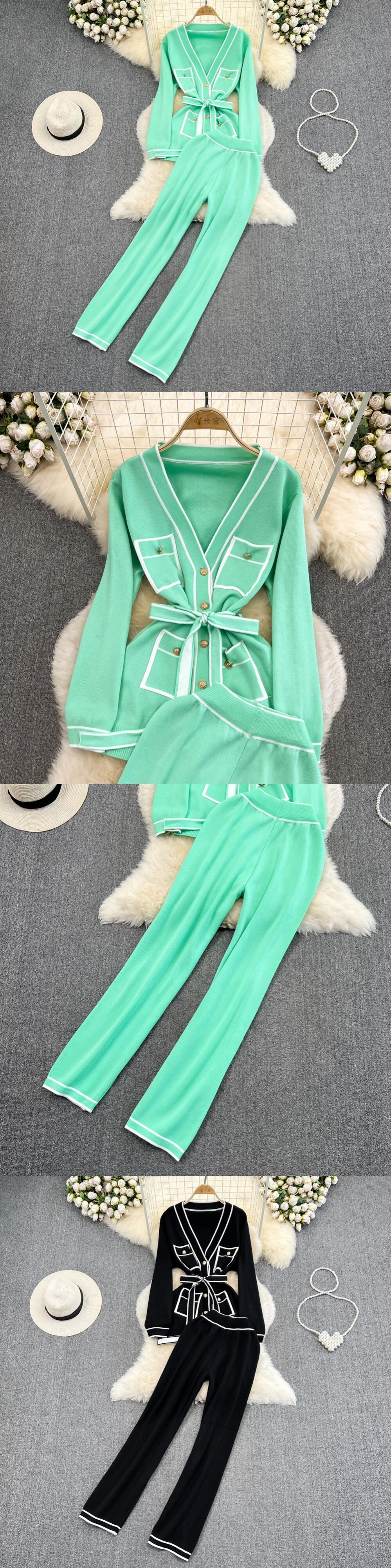Nomikuma 2022 セット女性ヒットカラー長袖 V ネック弓包帯カーディガン + ウエストワイドレッグセーターパンツ ロング リボン Vネック ワイドパンツ kor16549012052