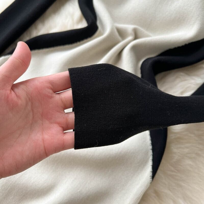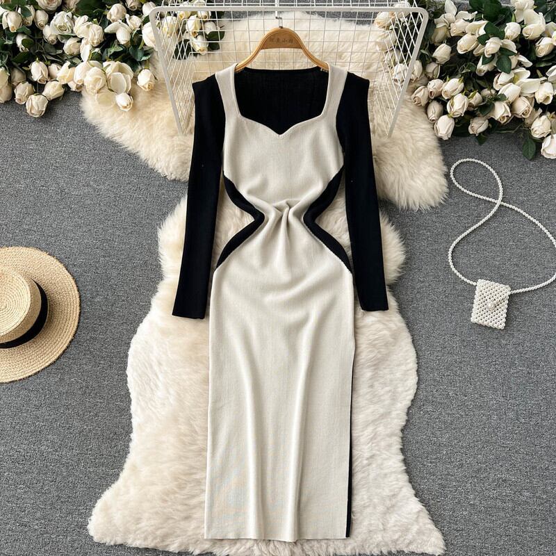 Nomikuma スクエアカラー長袖セータードレス女性コントラストカラーセクシースプリットニットボディコーンドレス ロング スクウェア kor60916714845