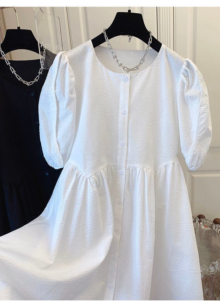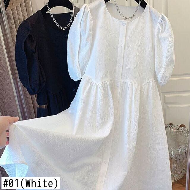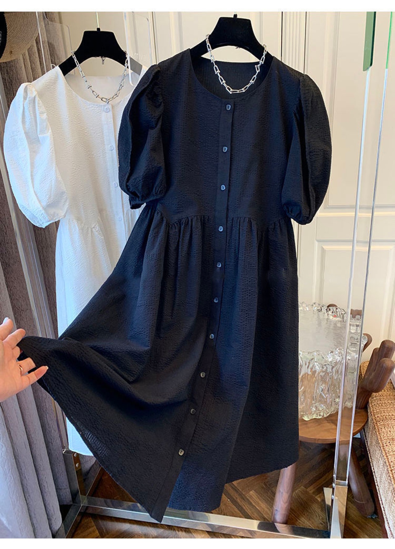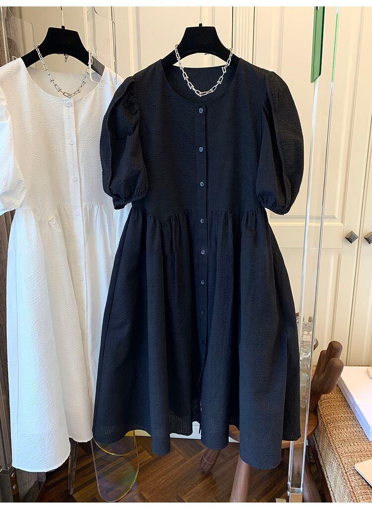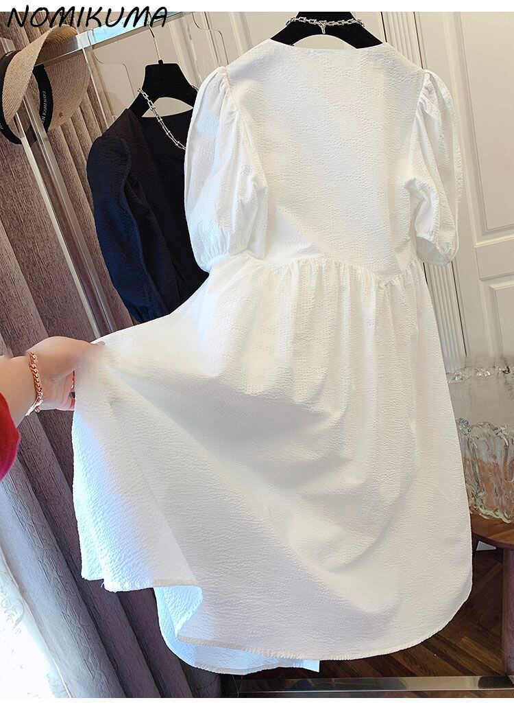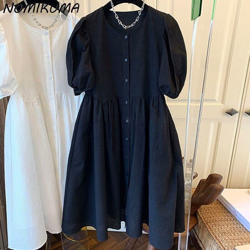 Nomikuma シックなパフスリーブシングルブレスト O ネックの女性ドレス因果甘い Vestidos 2022 夏無地ドレス 大人ガーリー スウィート キュート カジュアル サマー 夏物 Oネック ソリッドカラー kor6871989298