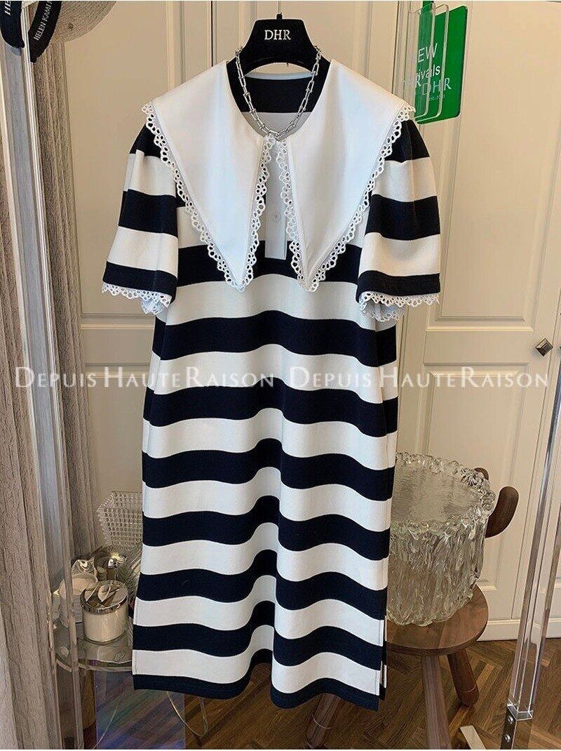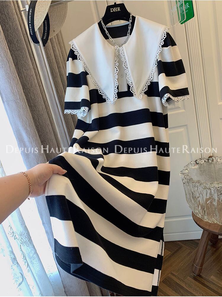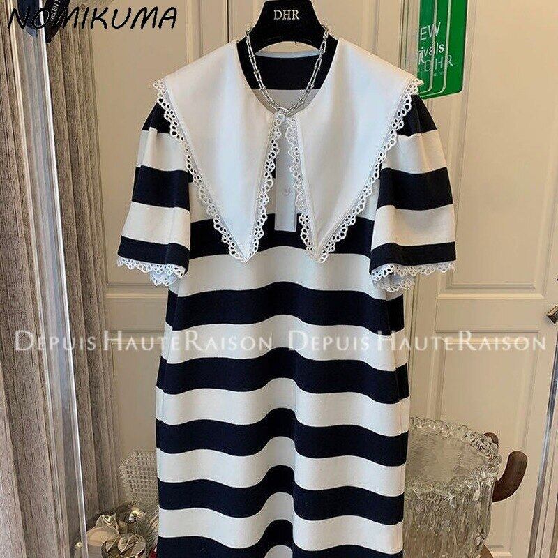 Nomikuma ストライプドレス女性シックなレースパッチワークピーターパン襟パフスリーブドレス因果 2022 Vestidos デ kor33532951680
