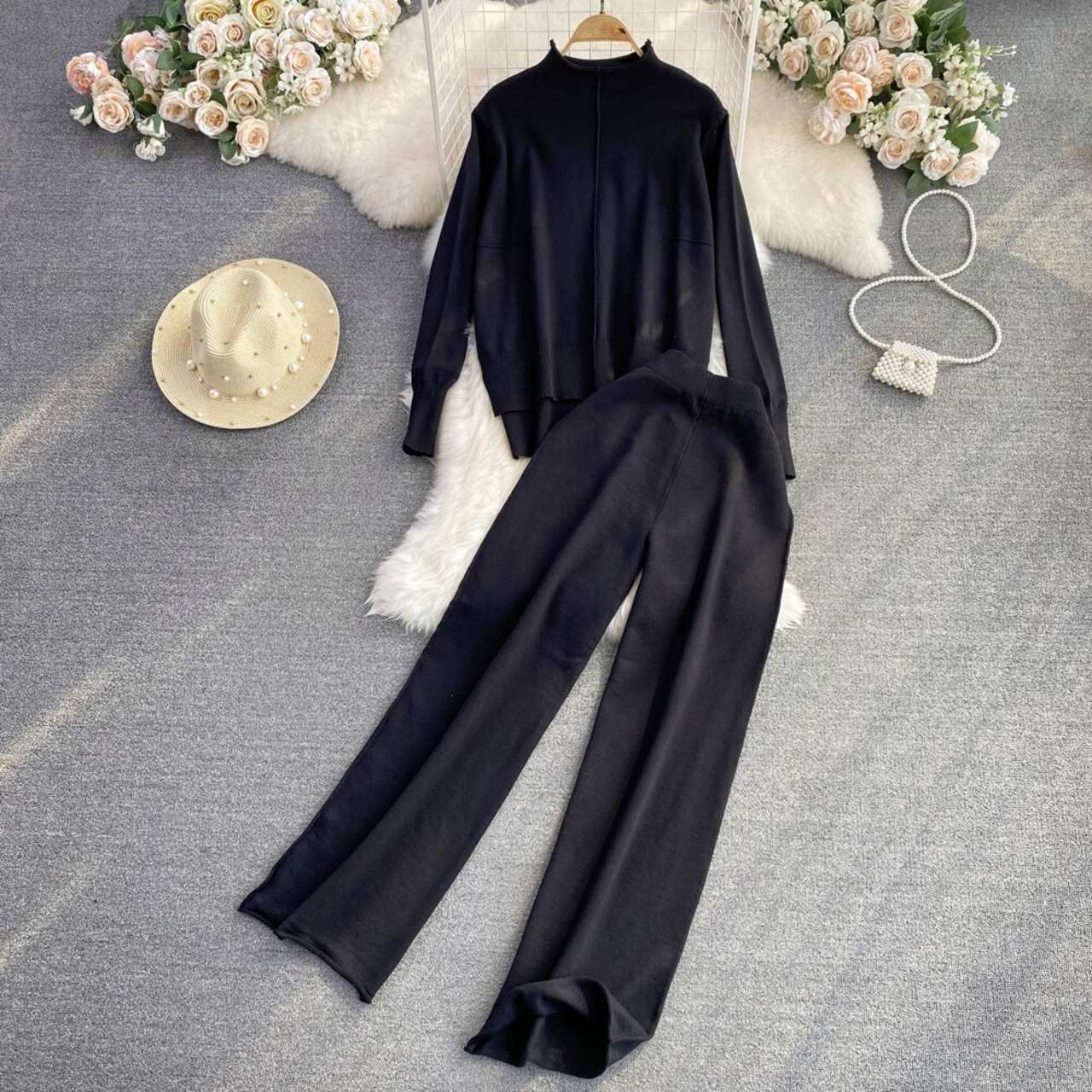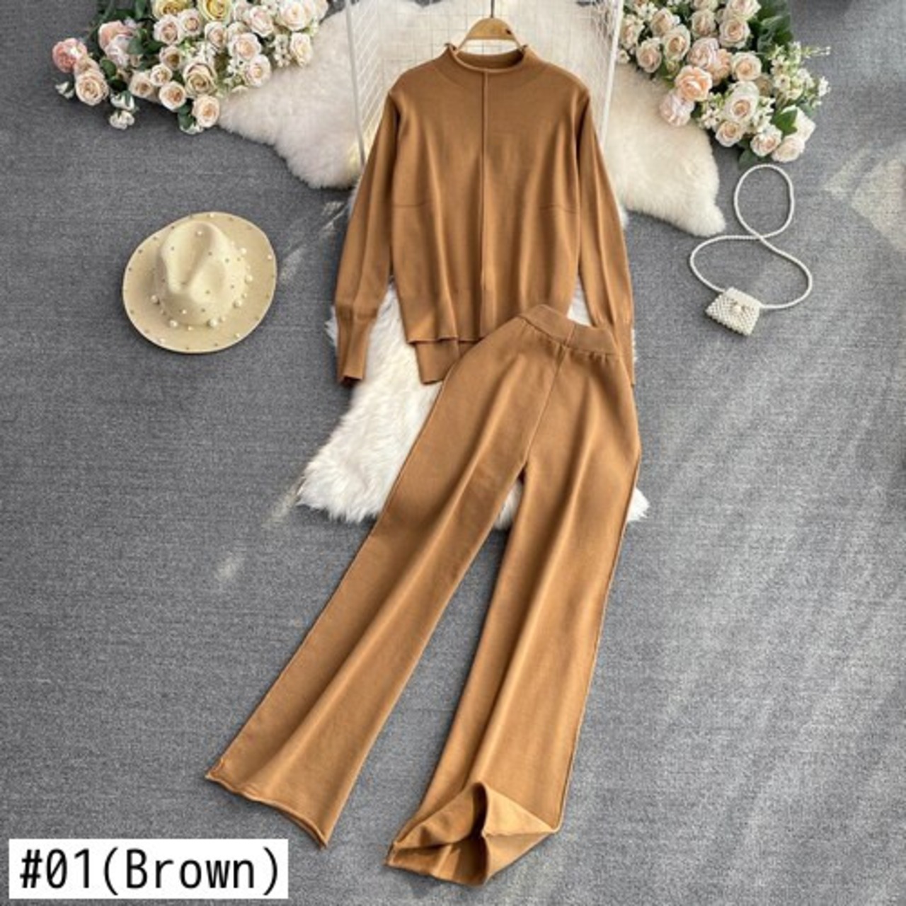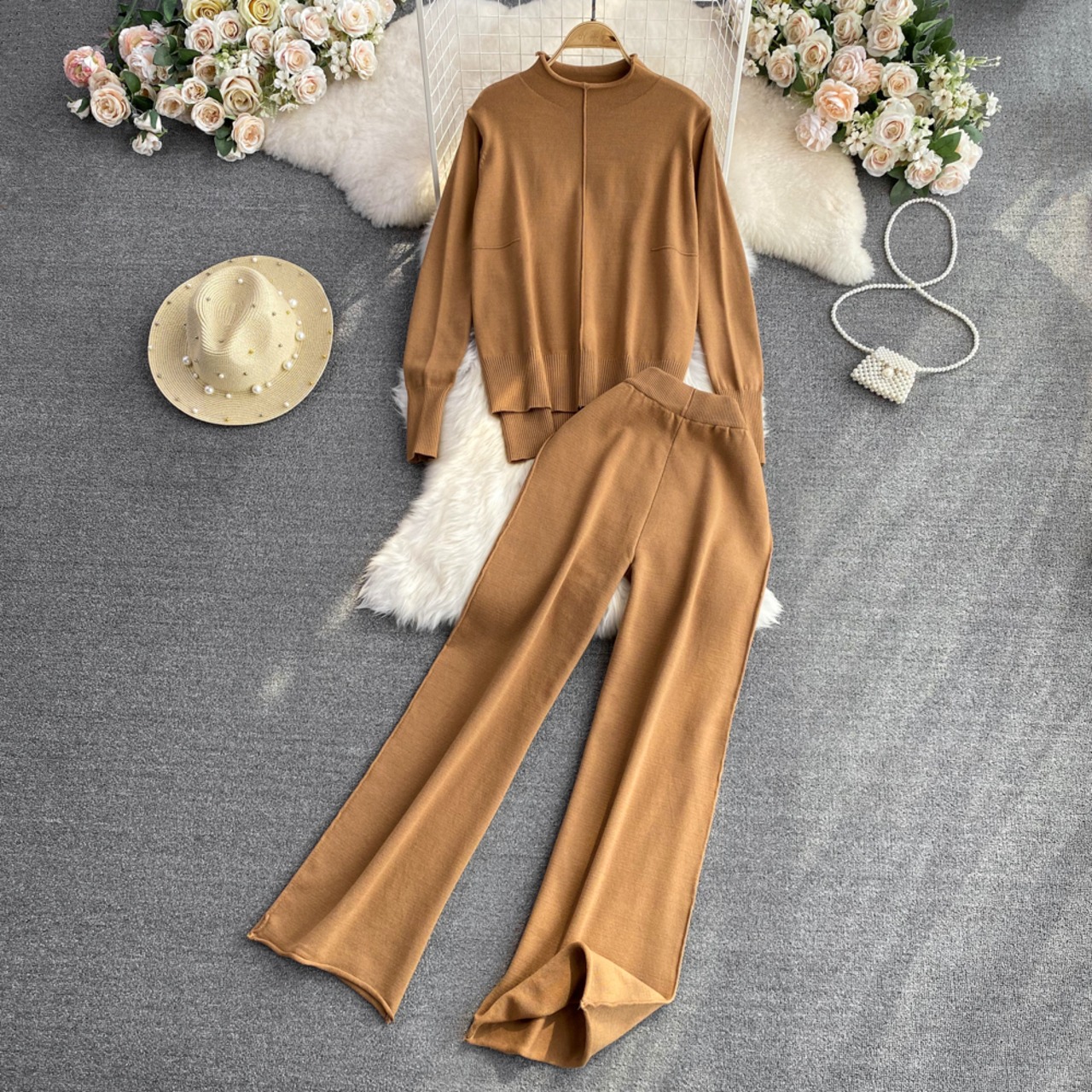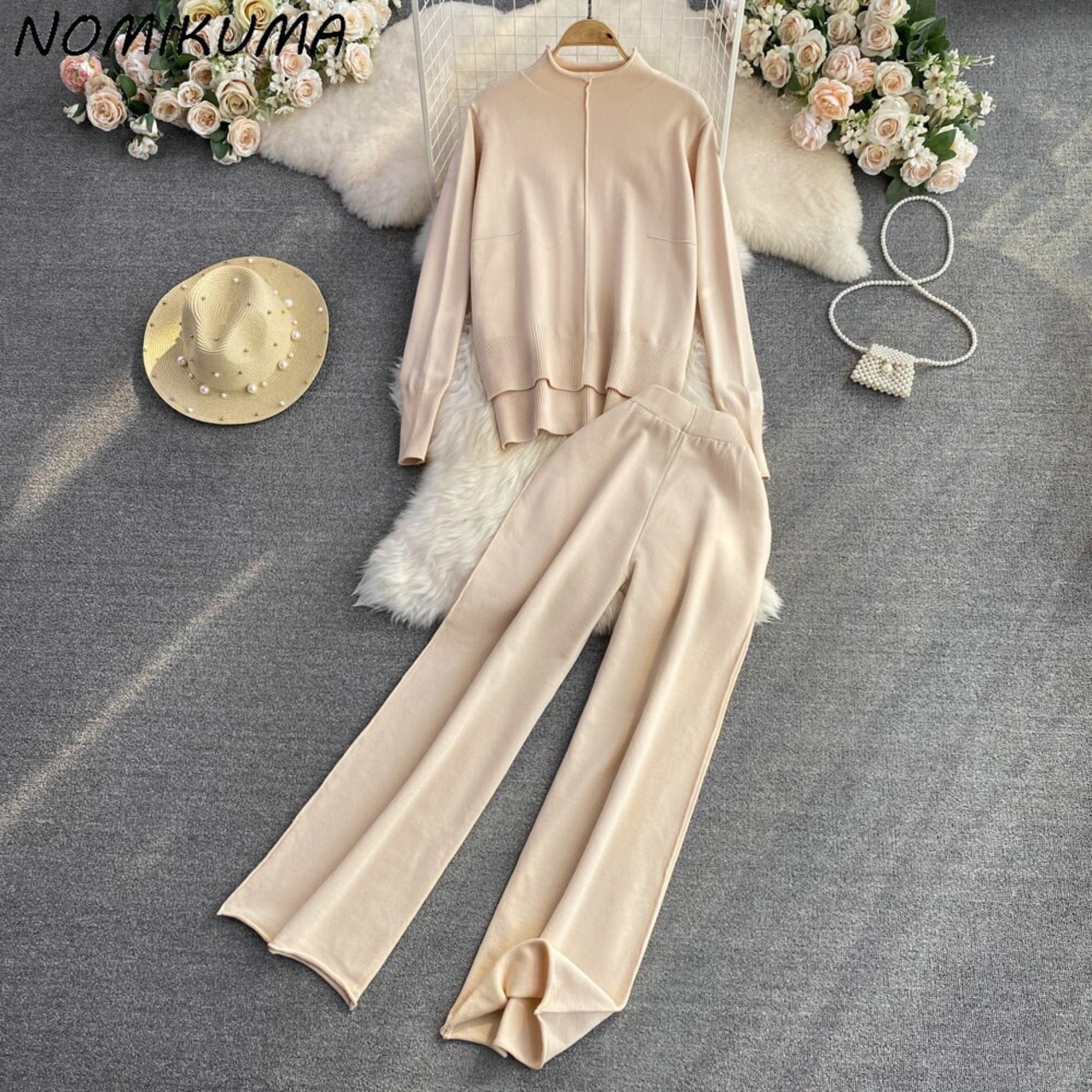 Nomikuma 2点セット レディース 衣装 ニット 半襟 長袖 プルオーバー ニット + ウエスト ワイドレッグ セーターパンツ ロング ワイドパンツ kor45960517006