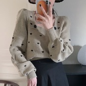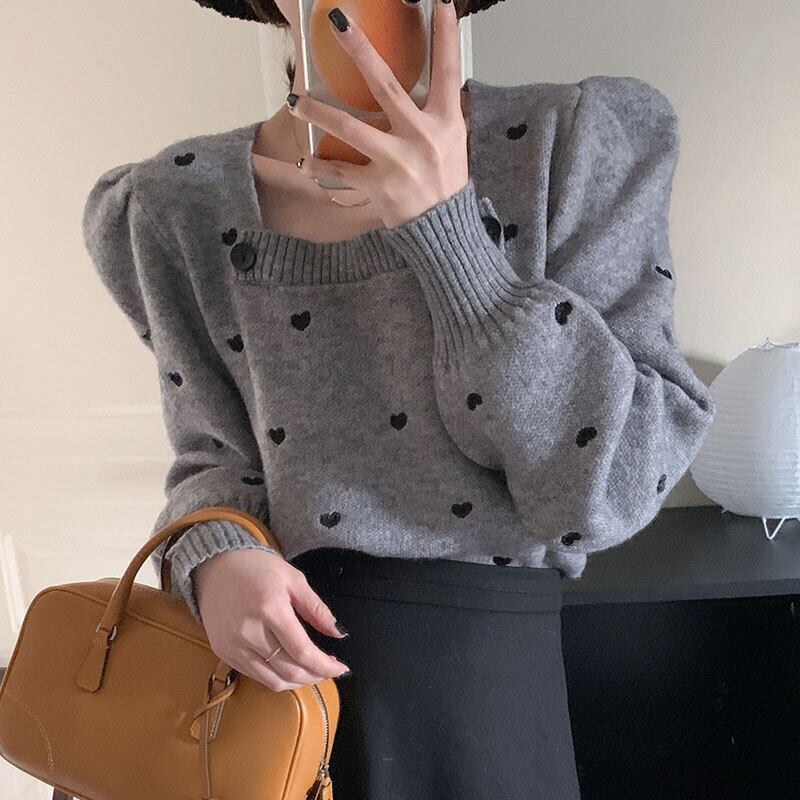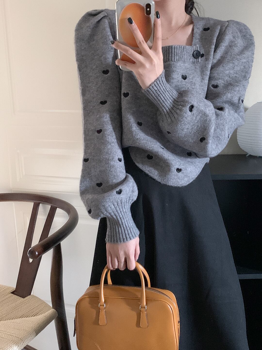Nomikuma シックなラブハート刺繍セーター女性スクエアカラーランタンスリーブニット 2022 秋ニットプルオーバー オータム 秋物 スクウェア kor86676512925