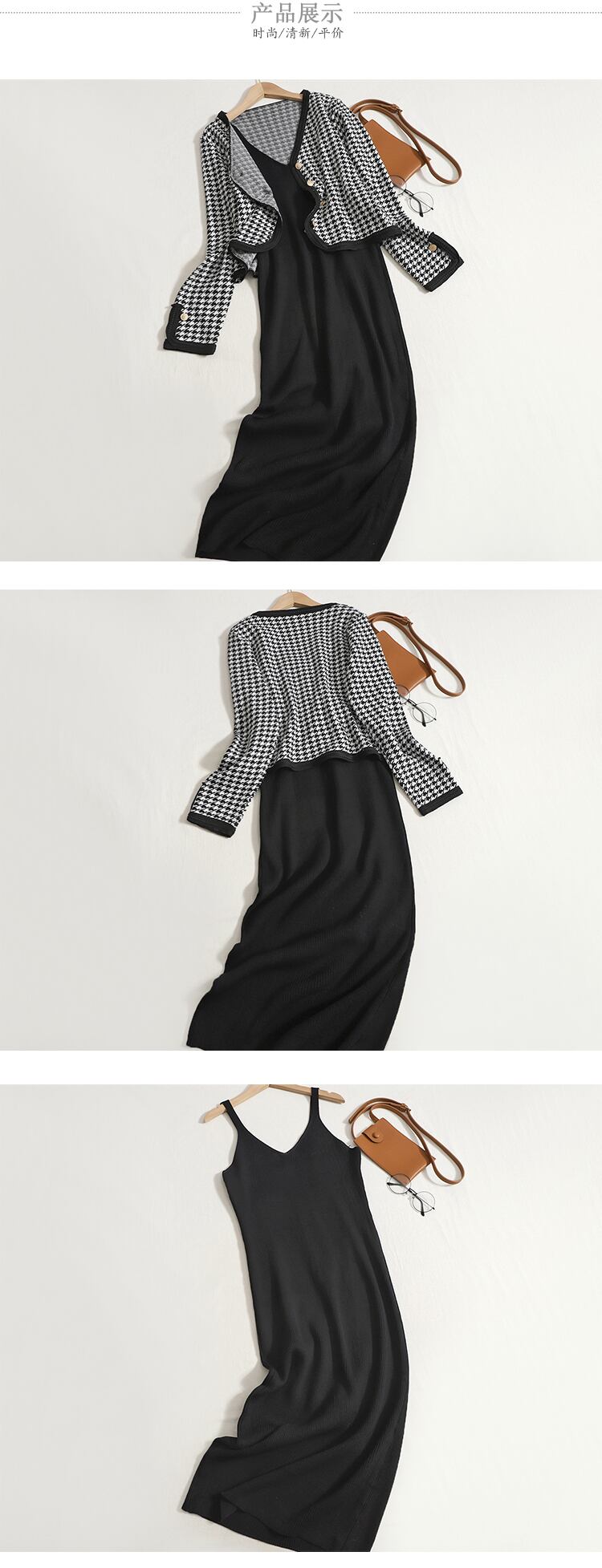 Nomikuma 秋 Elegnat ツーピース女性セット鳥格子カーディガンコート + ソリッド底入れスリングドレス 2022 衣装 オータム 秋物 ソリッドカラー kor6205930722