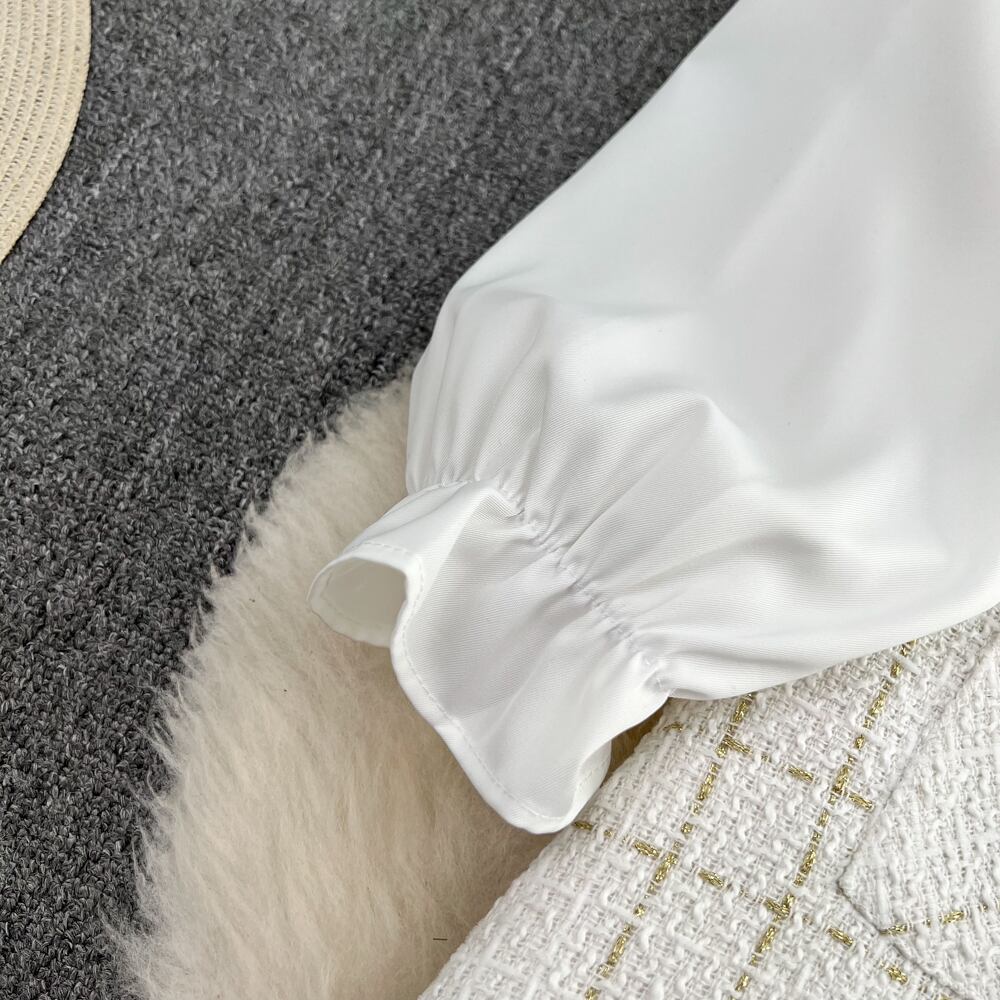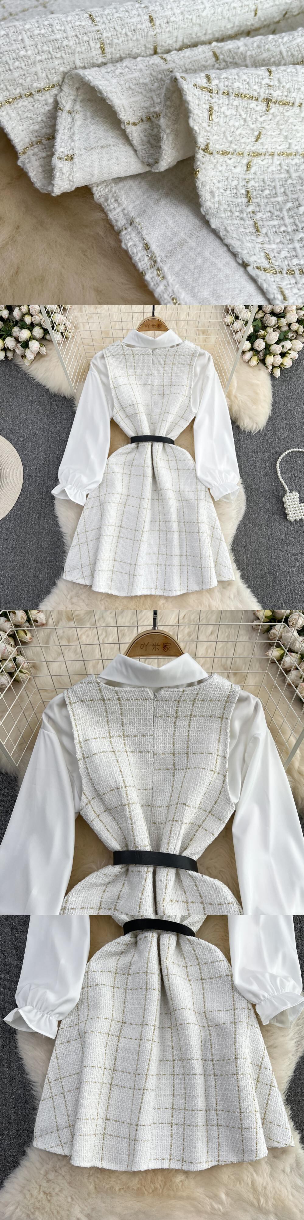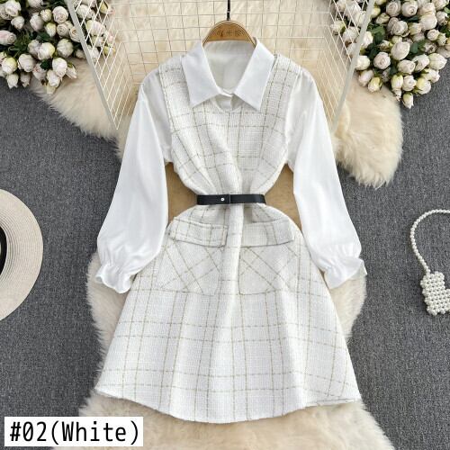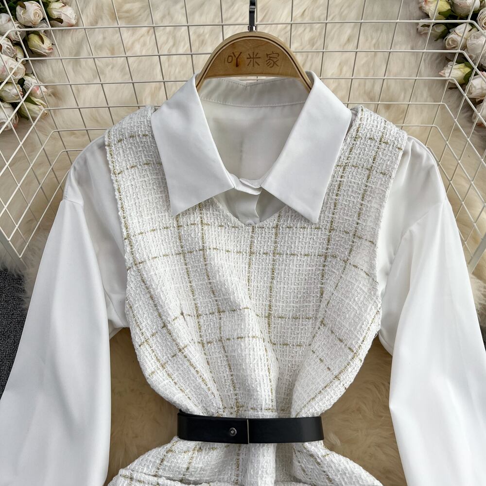 Nomikuma 2 ピース女性セット長袖無地ブラウス シャツ + チェック柄タンク ドレス ベルト スリム ウエスト衣装 ロング ハーネス ソリッドカラー kor88796741408