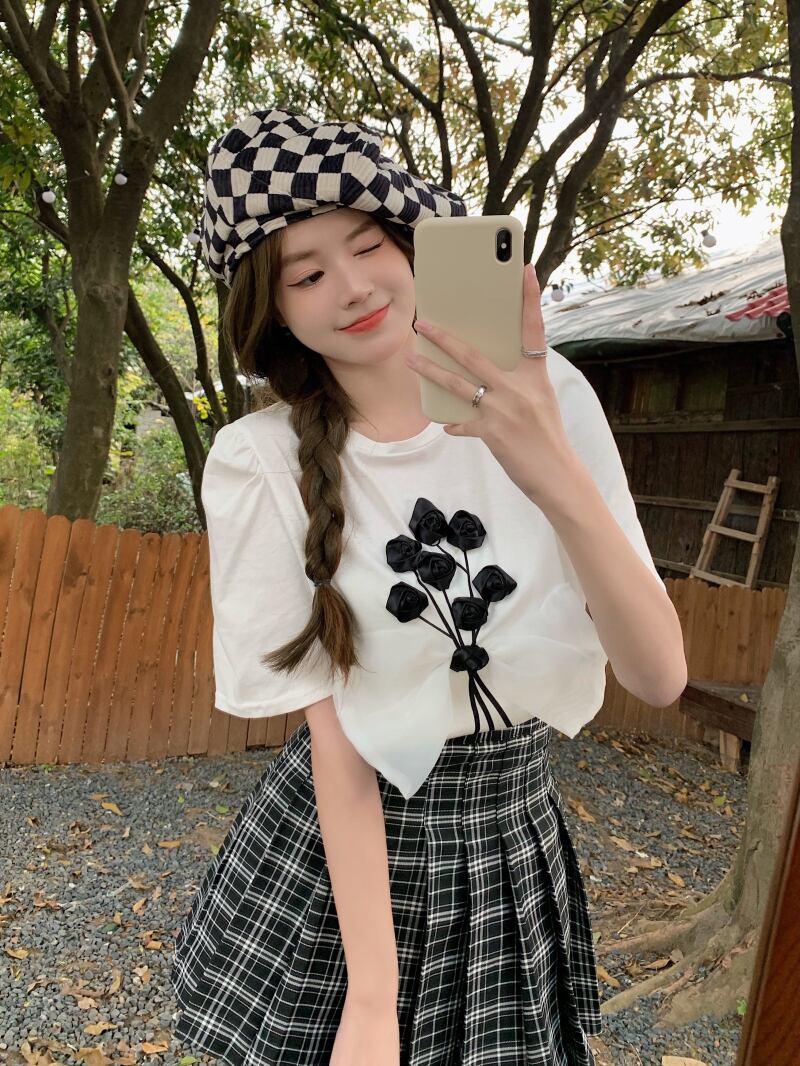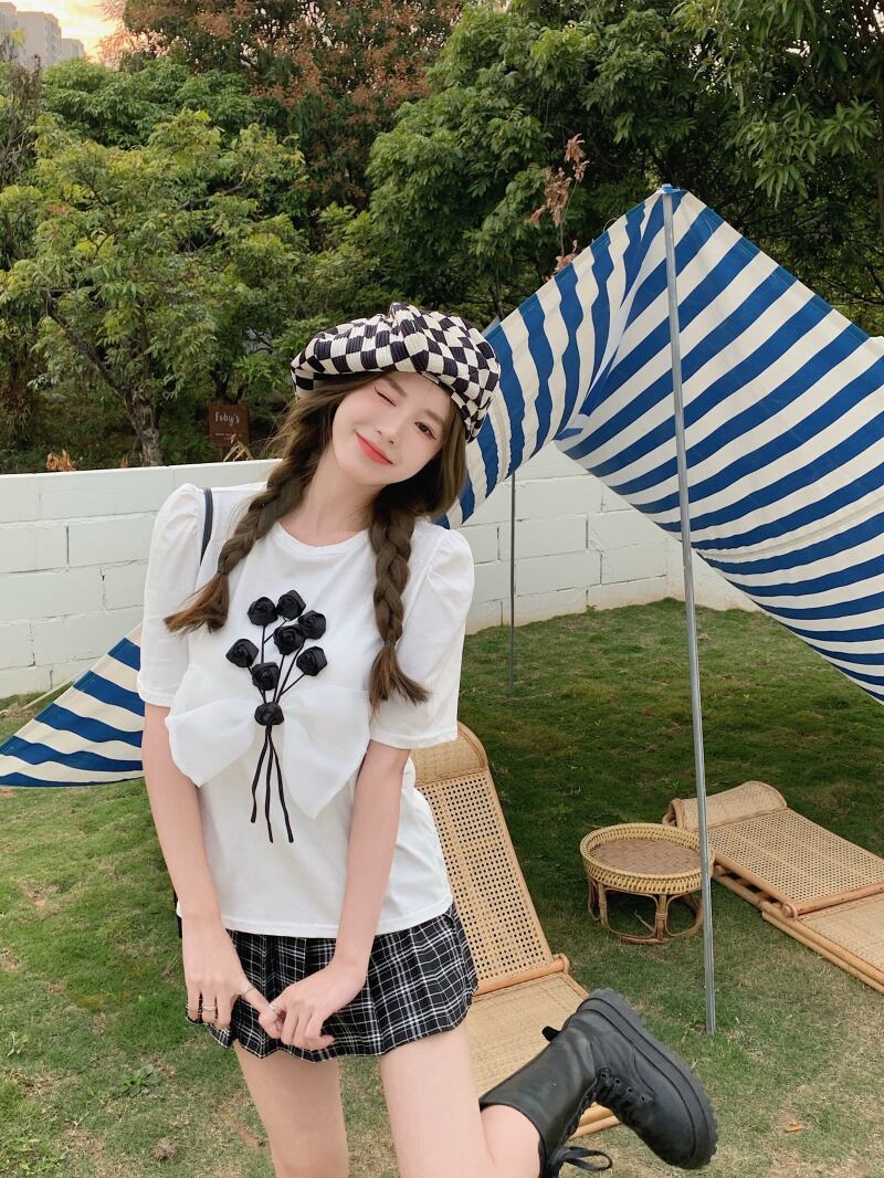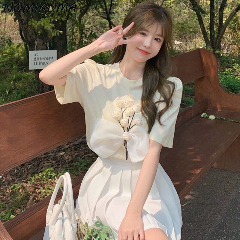 Nomikuma シックな 3D 花ちょう結びグラフィック Tシャツ女性半袖 O ネック Tシャツ 2022 夏甘いトップス ショート リボン ハーフスリーブ 大人ガーリー スウィート キュート カジュアル サマー 夏物 Oネック フラワーデザイン kor84207606346