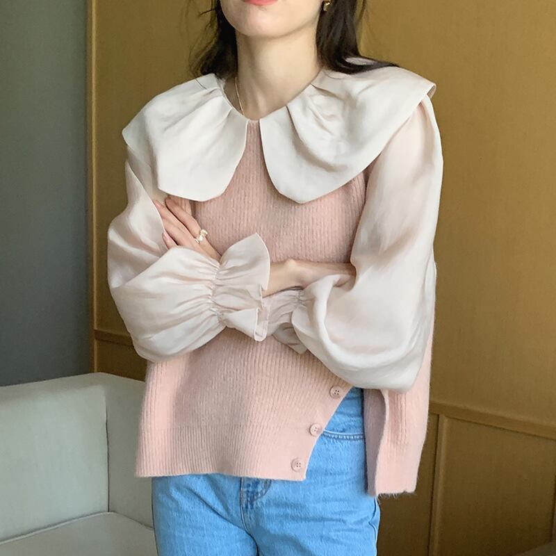 ノミクマシックスイートピーターパンカラーカジュアルフレアスリーブブラウス+Oネックスプリットニットベスト2点セット 大人ガーリー スウィート キュート kor12361597587