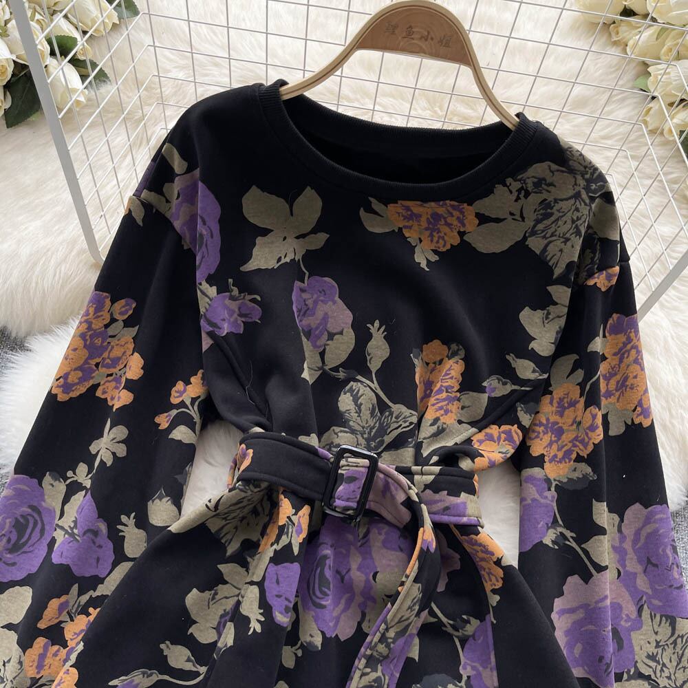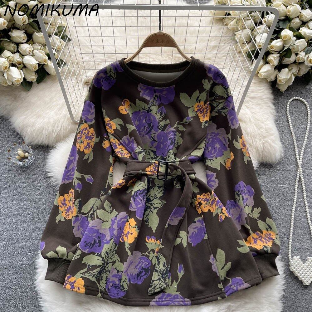 Nomikuma 印刷ベルトスリムウエストトレーナートップス因果長袖 O ネックパーカー 2022 秋の女性ジャンパー ロング オータム 秋物 ハーネス Oネック kor5444752323